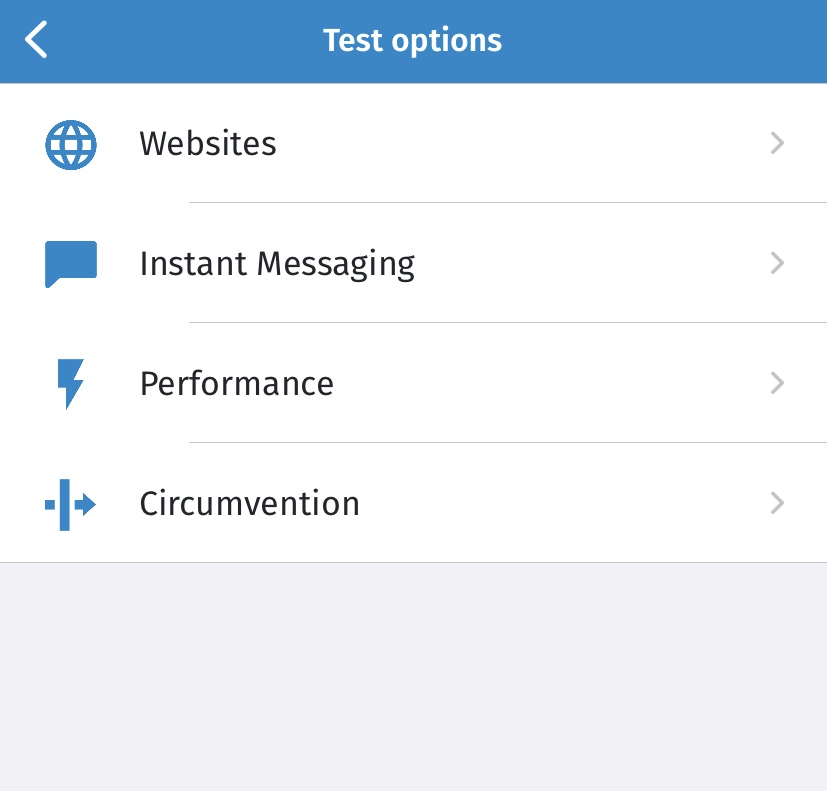 အကြောင်းအရာအလိုက် ကတ်တစ်ခုစီ (ဝဘ်ဆိုက်များ၊ Instant Messaging၊ ဆင်ဆာဖြတ်ကျော်ခြင်း၊ စွမ်းဆောင်ရည်)၏ အမျိုးမျိုးသော စမ်းသပ်ရွေးချယ်စရာများအပေါ် အခြေခံ၍ သင့်စမ်းသပ်မှုကို စိတ်ကြိုက်ပြင်ဆင်နိုင်ပါသည်။