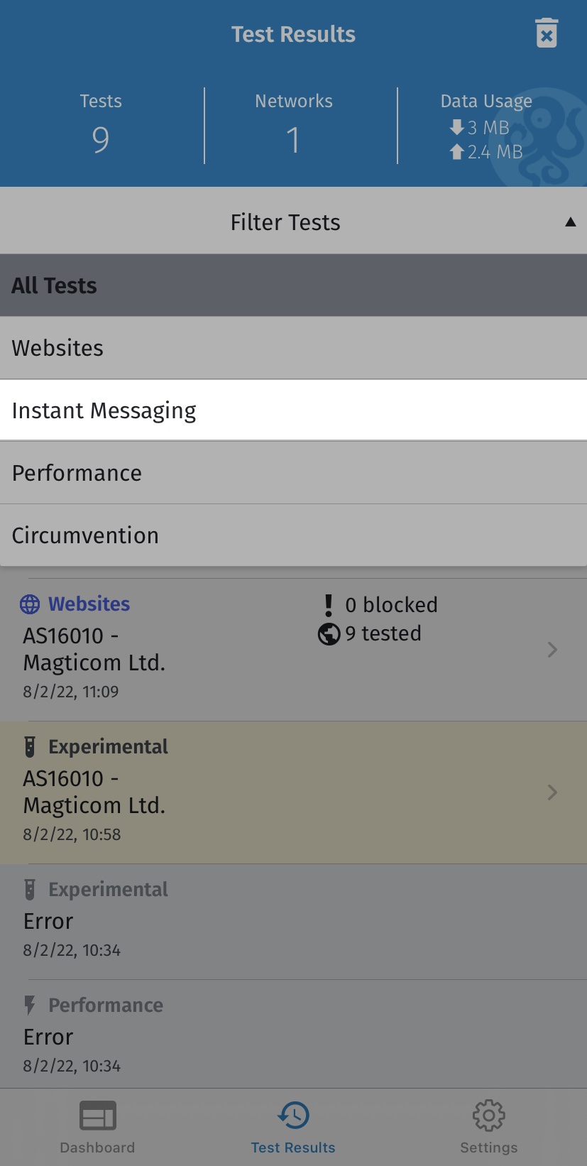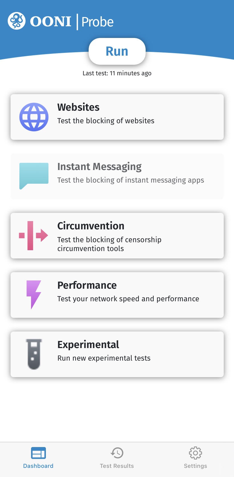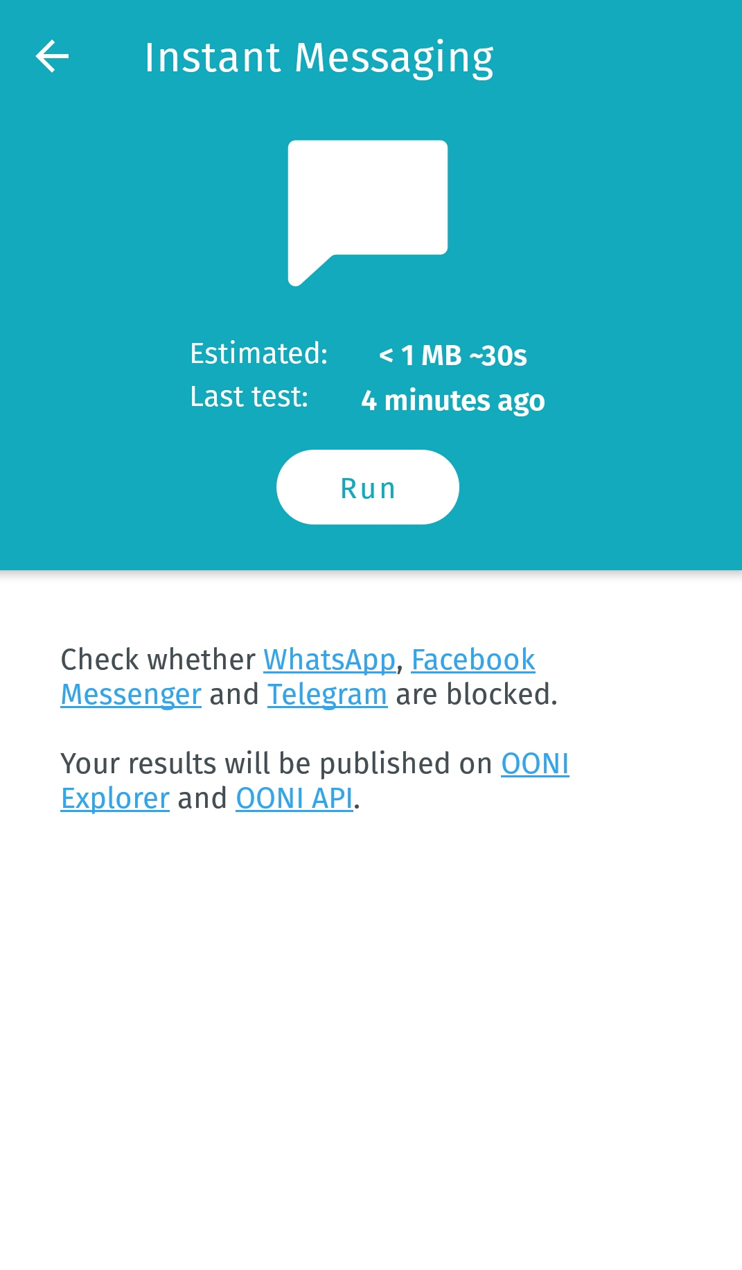- Instant Messaging card တွင် OONI ၏ WhatsApp၊Facebook Messenger၊ Telegram နှင့် Signal စမ်းသပ်မှုများ ပါဝင်၍ ၎င်းစမ်းသပ်မှုများသည် အဆိုပါ apps များကို ပိတ်ဆို့ထားခြင်းရှိ၊မရှိ စစ်ဆေးပေးသည်။