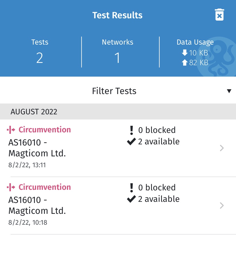 ယခုသင်သည် OONI Probe dashboard ၏ ဆင်ဆာဖြတ်ကျော်ခြင်း ကဒ် တွင်ပါဝင်သည့် စမ်းသပ်မှု (၂) ခု (Psiphon နှင့် Torတို့အတွက်)တို့ ကို မြင်တွေ့ရပါမည်။ စမ်းသပ်မှုနှစ်ခုလုံးကို နဂိုမူလစနစ်အရ ဖွင့်ထားပါသည်။