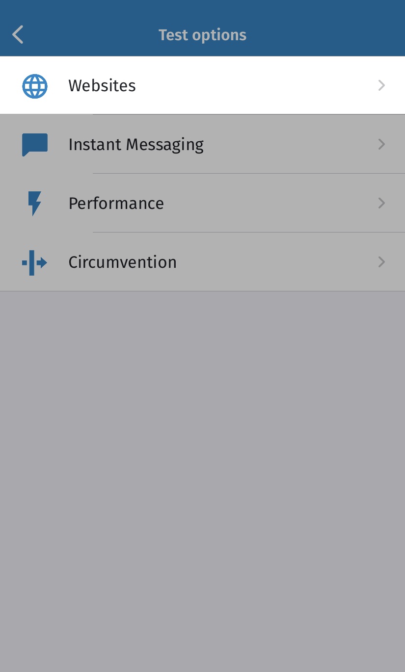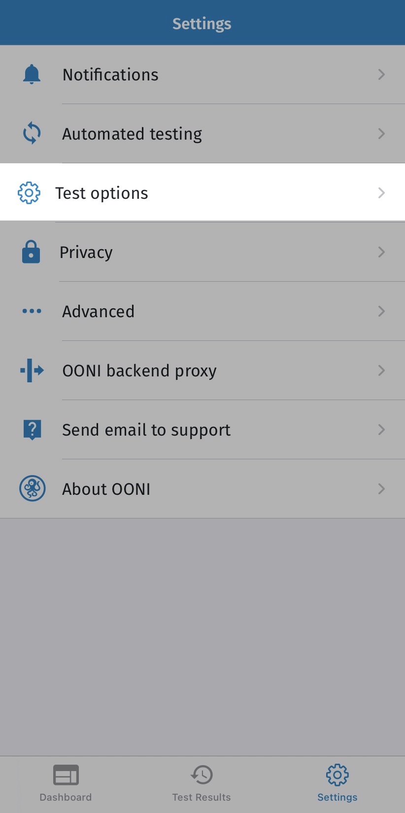 အဆင့် (၁)။ သင့် OONI Probe app ၏ ဆက်တင်များမှတစ်ဆင့် စမ်းသပ်မှုရွေးချယ်မှုများ ကိုနှိပ်ပါ။