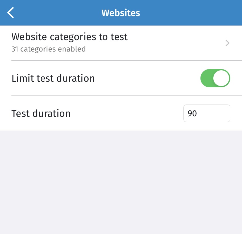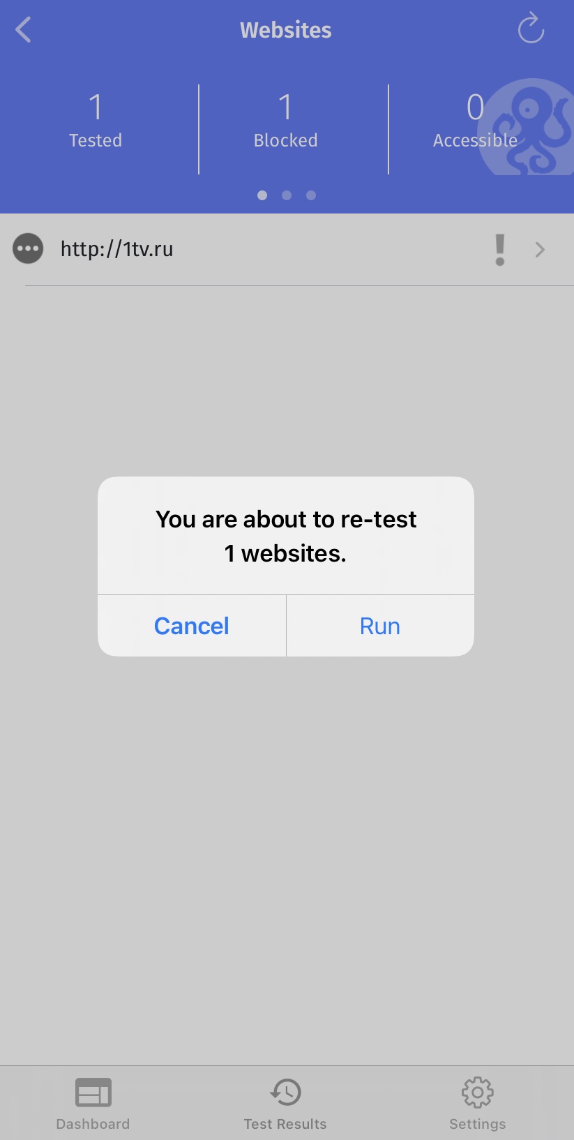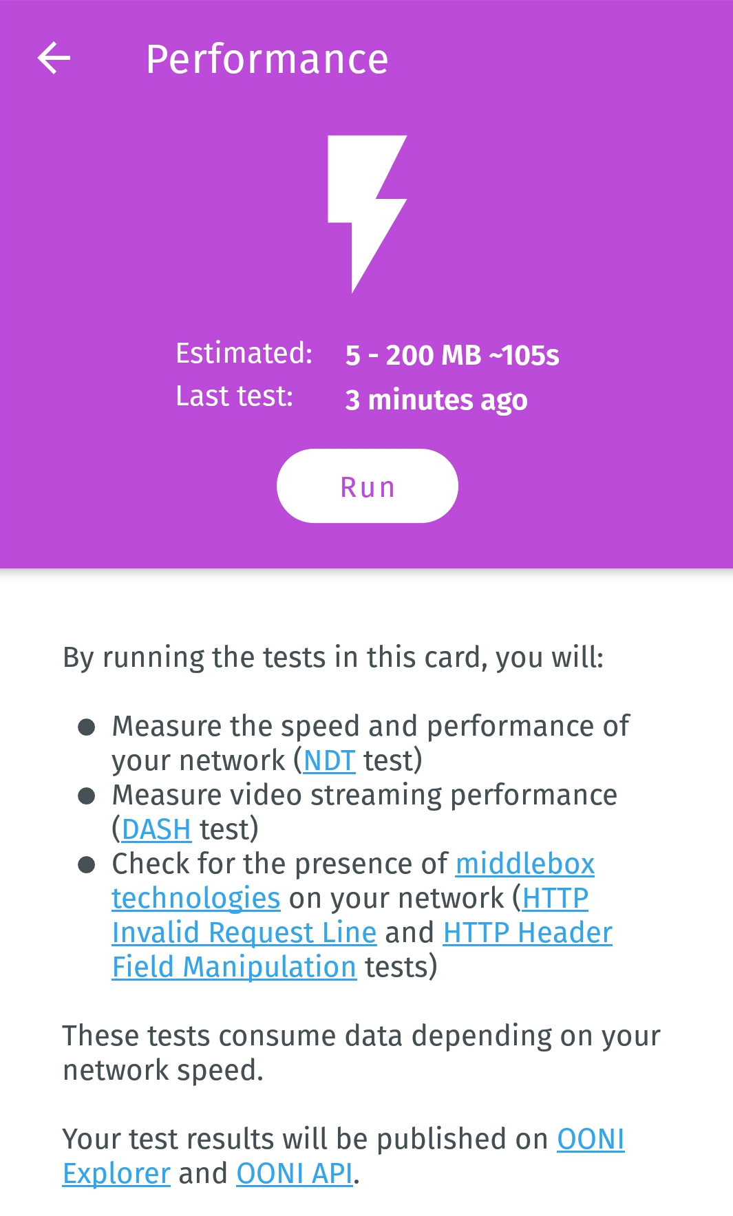 မှတ်ချက် သင့် မိုဘိုင်းဒေတာအားလုံးကို အသုံးပြုခြင်းမှ ရှောင်ရှားစေရန်အတွက် သင် Run ကို နှိပ်လိုက်သောအခါ (Dashboard မှ ဖြစ်စေ Websites Card မှ ဖြစ်စေ) OONI Probe သည် စက္ကန့် ၉၀ အတွင်း စမ်းသပ်နိုင်သလောက် ဝဘ်ဆိုက်များကို သာ စမ်းသပ်ပေးသွားမည်ဖြစ်သည်။ ဤ ဝဘ်ဆိုဒ်များ (စက္ကန့် ၉၀ အတွင်းစမ်းသပ်ထားသော) ကို global နှင့် (relevant) country-specific စမ်းသပ်စာရင်းများမှ ကျပန်းရွေးချယ်ထားခြင်းဖြစ်သည်။ သင်သည် Run ကို နှိပ်လိုက်သည့်အခါတိုင်း စက္ကန့် ၉၀ အတွင်း (ကမ္ဘာလုံးဆိုင်ရာနှင့် နိုင်ငံအလိုက် သီးခြားစမ်းသပ်စာရင်းများမှ) ဝဘ်ဆိုက်များကို အလှည့်ကျရွေးချယ်၍ ခွဲခြားစမ်းသပ်ပေးသွားမည်ဖြစ်သည်။ ထို့ကြောင့် သင်သည် Run ကို အကြိမ်ဖန်များများနှိပ်လေ ဝဘ်ဆိုက်များများစမ်းသပ်လေဖြစ်မည်။