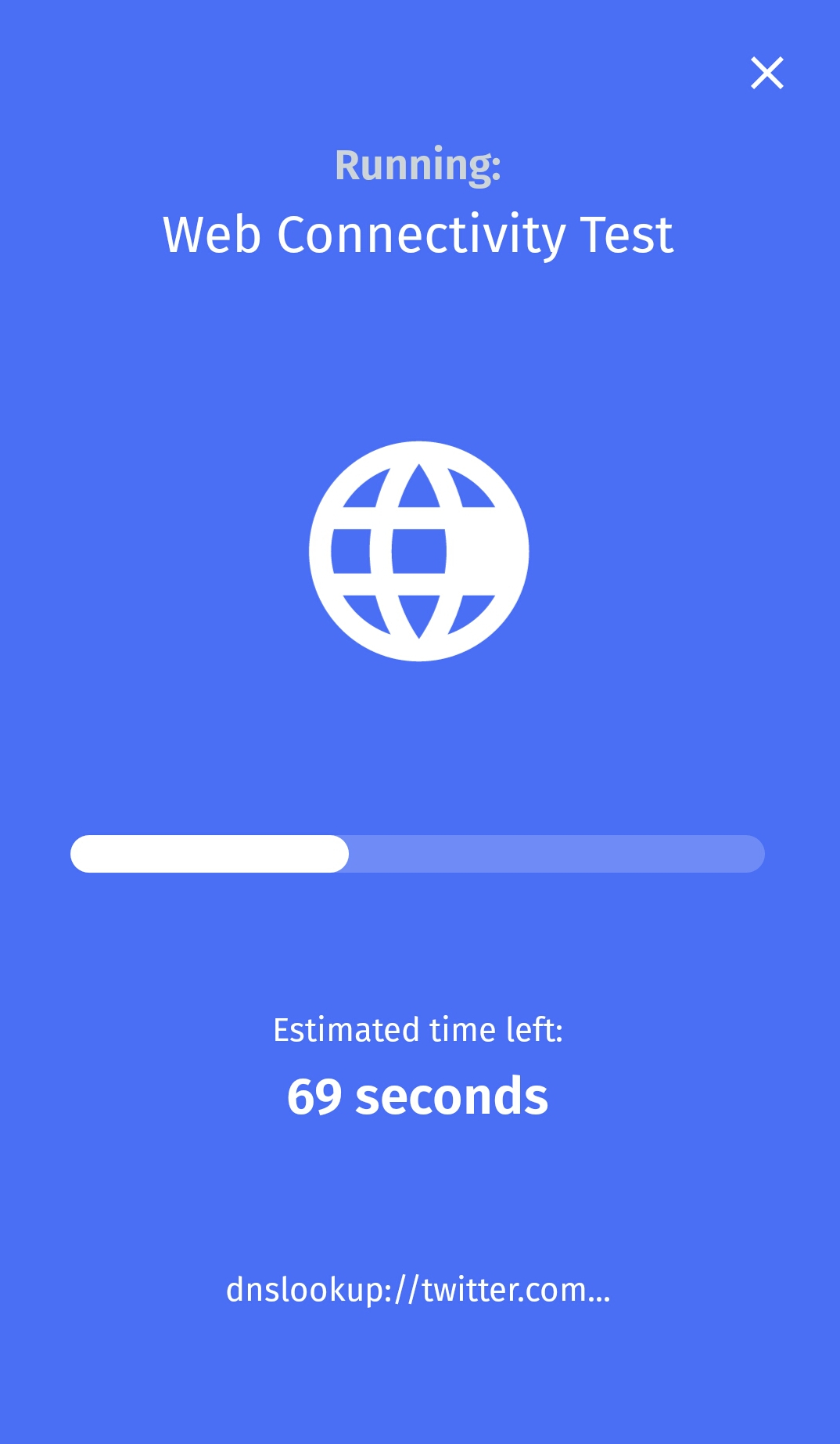 OONI Probe သည် စမ်းသပ်မှုအားလုံးကို မိနစ်အနည်းငယ်အတွင်း(၎င်းသည် သင်ချိတ်ဆက်ထားသော စွမ်းဆောင်ရည်အပေါ်မူတည်၍ အချို့ဖြစ်ရပ်များတွင် ပို၍ကြာနိုင်သည်။) လုပ်ဆောင်ပေးသင့်သည်။ သင့်ကွန်ရက်၏စွမ်းဆောင်ရည်သည် ကောင်းစွာ လုံလောက်မှု မရှိပါဘဲ စမ်းသပ်မှုများသည် အချိန်ကြာမြင့်နေပါက သင်သည် ဆက်လက်လုပ်ဆောင်နေသော စမ်းသပ်မှုများကိုရပ်တန့်ရန် အတွက် Stop test(စမ်းသပ်မှုအားရပ်တန့်ပါ) ဟူသော ခလုပ်ကို နှိပ်၍ ဆောင်ရွက်နိုင်ပါသည်။