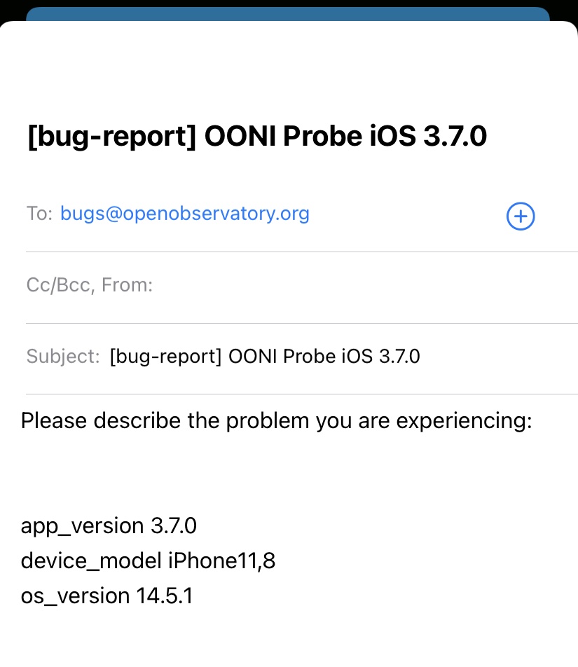 အဆင့်(၂)။ OONI Probeဖြင့် ဆောင်ရွက်ရာတွင် သင်တွေ့ကြုံနေရသည့် ပြဿနာများကို ဖော်ပြကာ အီးမေးလ်တစ်စောင်ရေးပါ။ ပြဿနာအပေါ် မူတည်၍ မှတ်တမ်းနှင့်/သို့မဟုတ် raw measurement dataကို ကျွန်ုပ်တို့နှင့်အတူ(ဤလမ်းညွှန်ချက်၏ သင့် OONI စစ်ဆေးမှုရလဒ်များကို မျှဝေခြင်း အပိုင်းတွင် ရှင်းပြထားသည့်အတိုင်း) မျှဝေရန် အတွက် ၎င်းသည် အသုံးဝင်နိုင်သည်။