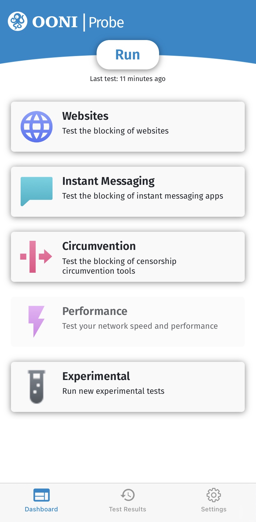 OONI Probe mobile app ၏ Dashboard တွင် OONI Probe စမ်းသပ်မှုတစ်ခုစီ ပါရှိသည့် ကဒ် (၅) ကဒ်ပါ ဝင်သည်။