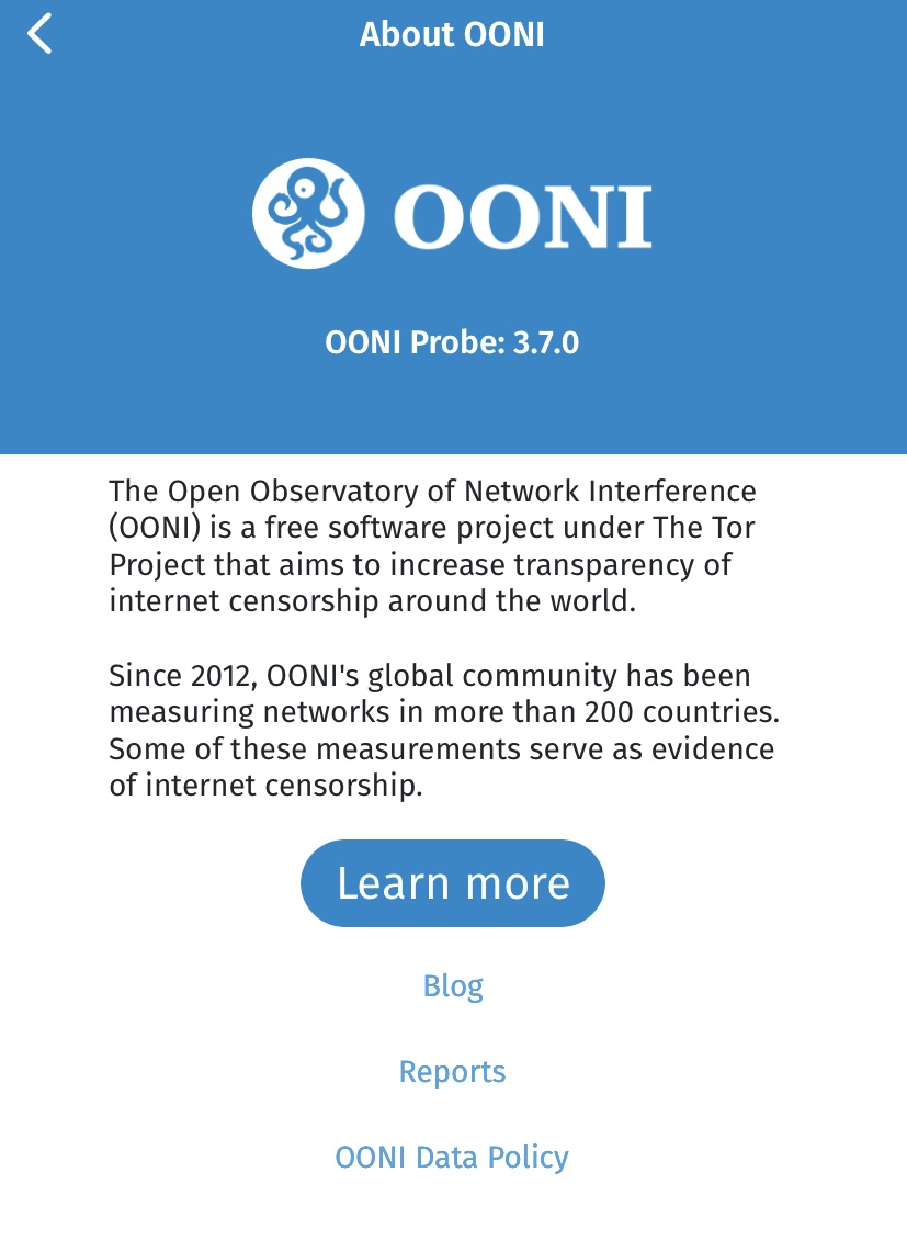 OONI Probe app ၏ နောက်ဆုံး OONIအကြောင်း ဆက်တင်သည် OONI အကြောင်း နှင့် သင်လက်ရှိအသုံးပြုနေသော OONI Probe software version အကြောင်း အချက်အလက်များကို မျှဝေထားပါသည်။