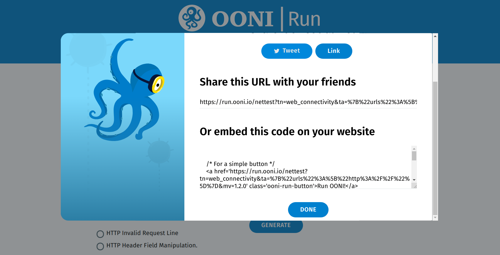 - Make the generated OONI Run link more prominent in the pop-up window. Several participants did not notice the generated OONI Run link, and only used the “Link” button, which did not work on desktop.