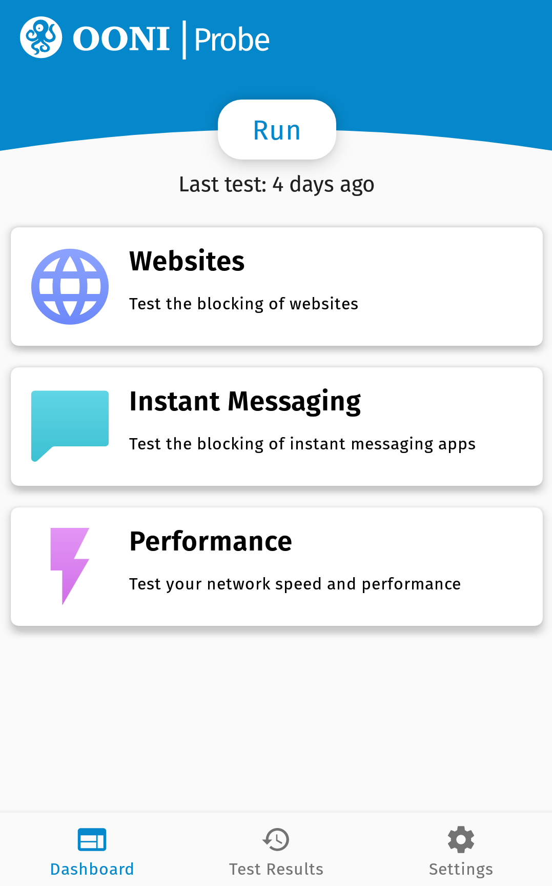 OONI Probe tətbiqin idarə panelində “Run”/”test et” düyməsinə basın (bütün testləri tətbiq etmək üçün)