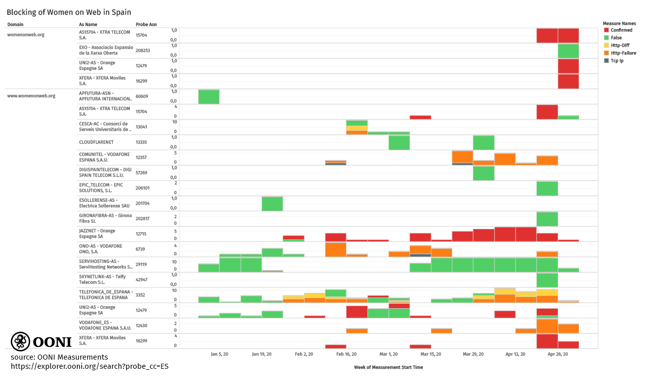 Source: OONI data on the blocking of Women on Web in Spain between 1st January 2020 to 28th April 2020.