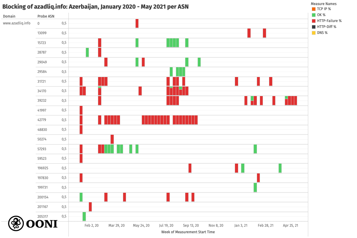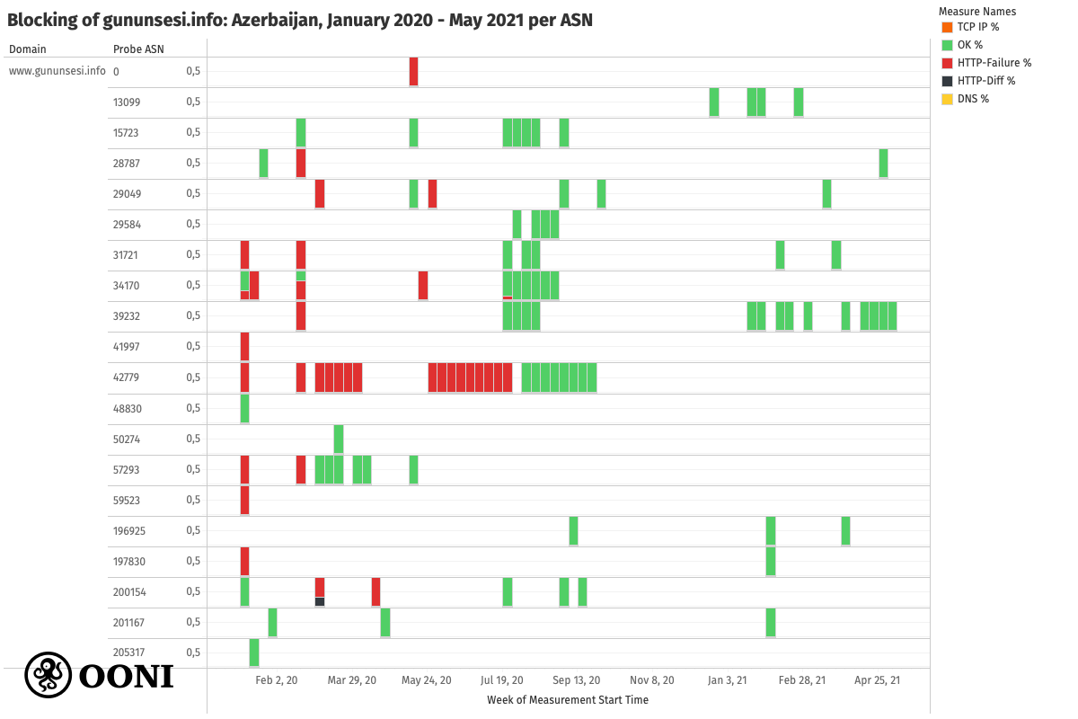 across AS networks in Azerbaijan between February 2020 to April 2021 based on OONI data, https://explorer.ooni.org/search?until=2021-06-04&since=2021-05-05&domain=www.gununsesi.info&probe_cc=AZ