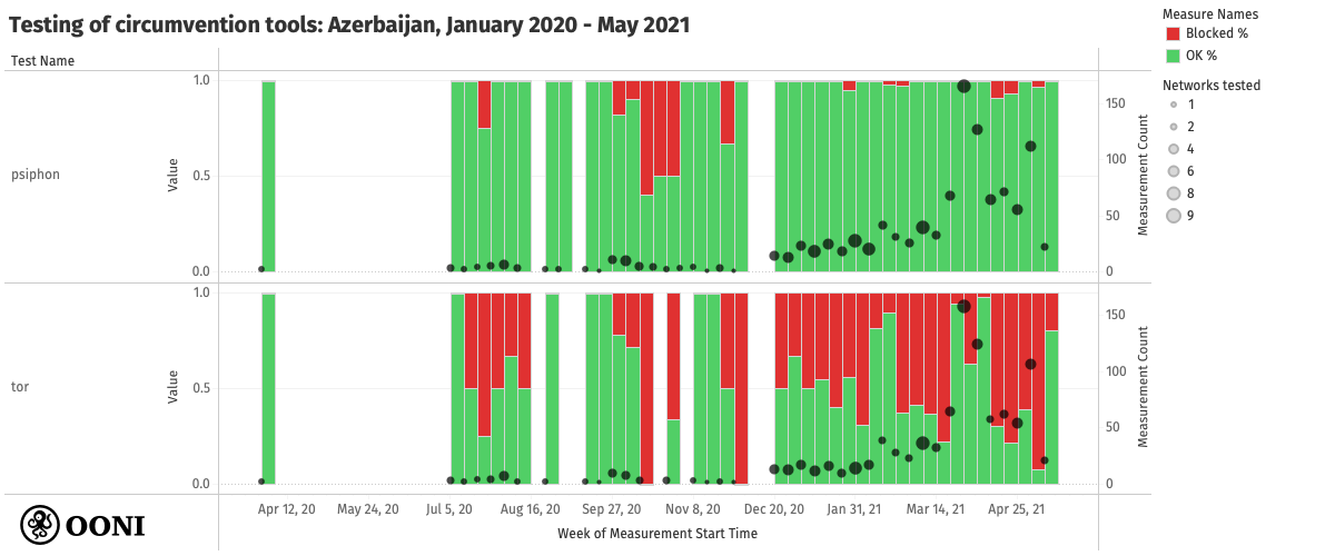 The following chart aggregates all OONI measurements collected from the testing of Psiphon and Tor on up to 9 AS networks in Azerbaijan, between January 2020 to May 2021.