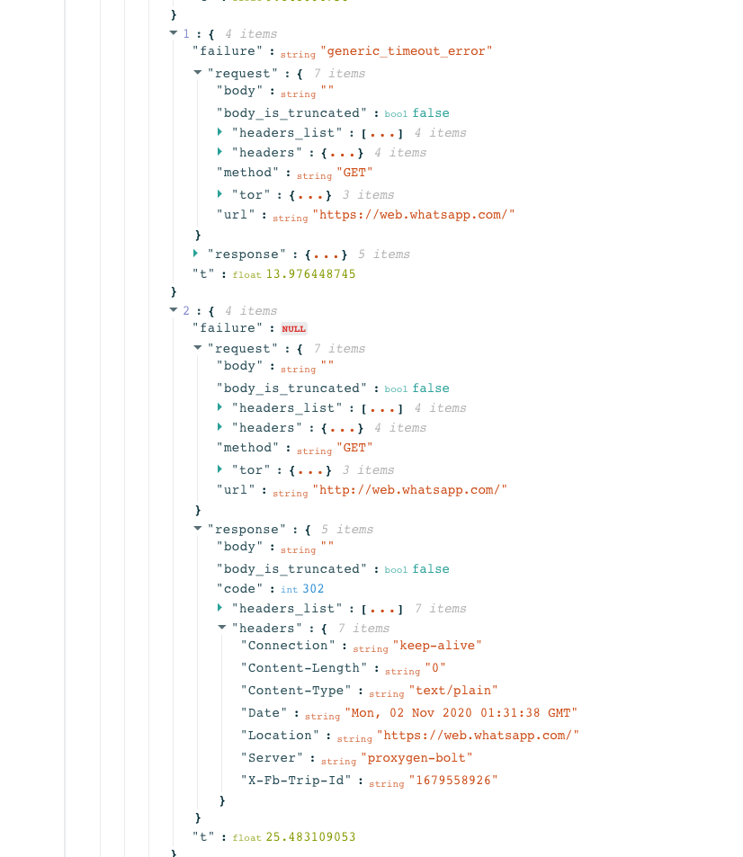 Within the anomalous measurements (which suggested WhatsApp blocking), we observe that attempted connections to WhatsApp’s registration service and web interface (web.whatsapp.com) failed. It’s worth noting that in some cases, the HTTP request to web.whatsapp.com succeeded, while the HTTPS request failed, as illustrated below.