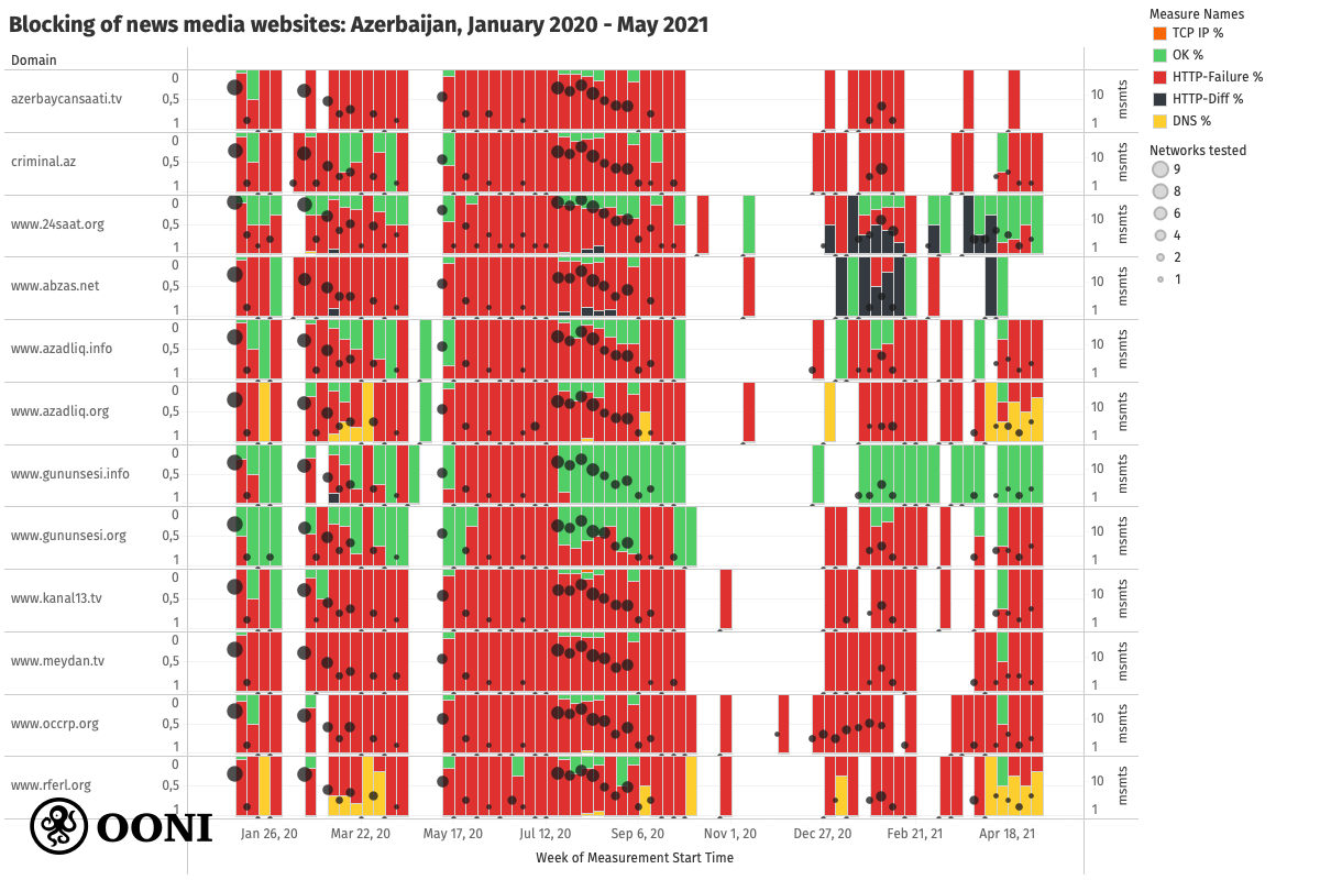 Press freedom appears to be quite limited in Azerbaijan, as suggested by the blocking of several independent news media websites in the country. These media websites presented signs of blocking throughout their testing (on several local AS networks) between January 2020 to May 2021 (corroborating past reports on the blocking of media websites in Azerbaijan), with recent OONI measurements suggesting that their blocking remains ongoing.