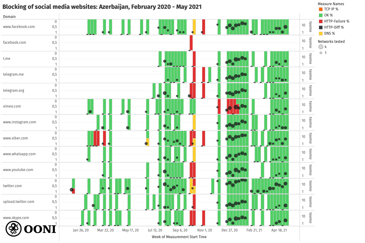 Amid the 2020 Nagorno-Karabakh war, OONI data shows that access to several social media websites and apps was blocked in Azerbaijan. The following chart, limited to social media websites that presented signs of blocking between February 2020 to May 2021, aggregates OONI measurement findings collected from 4 AS networks in Azerbaijan.