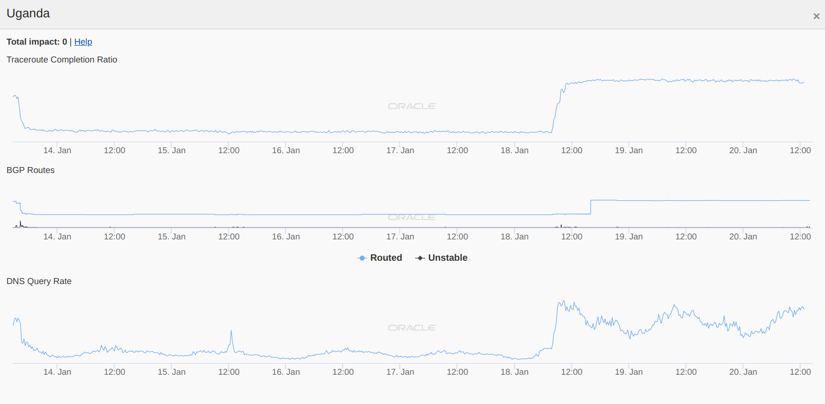 The same drop in traffic between 13th to 18th January 2021 can be seen in data from Oracle Internet Intelligence (now discontinued), Google traffic data, and Cloudflare radar data, as illustrated through the following charts.