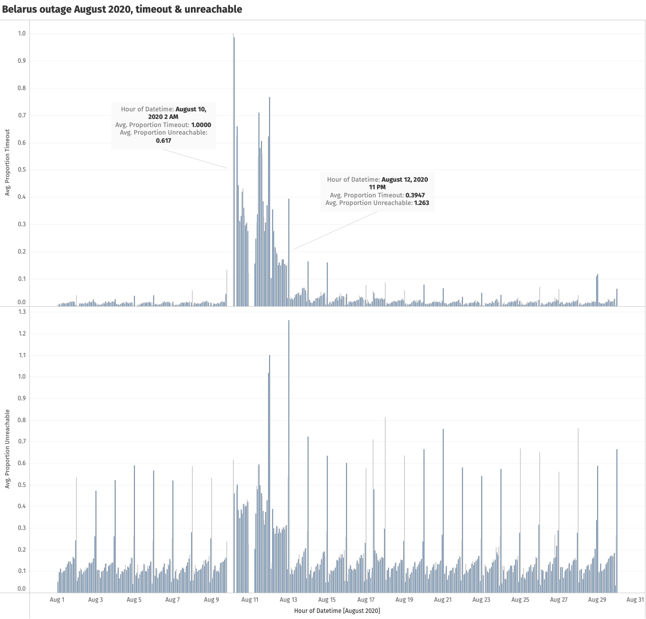 Starting on 10th August 2020 (as illustrated above), we observe a spike in the average proportion of connections timing out. As some telemetry continued to be submitted during this period nonetheless, it may be indicative of an unreliable connection. The high rate of connection timeouts appears to persist until at least 23:00 UTC on 12th August 2020, which is consistent with the duration of the outage observed in IODA and Google traffic data.