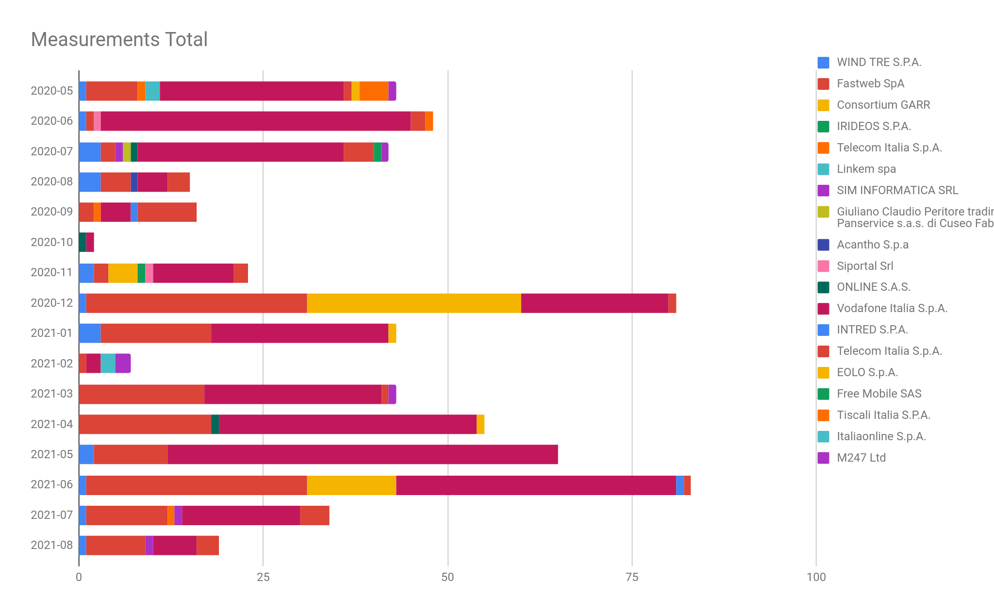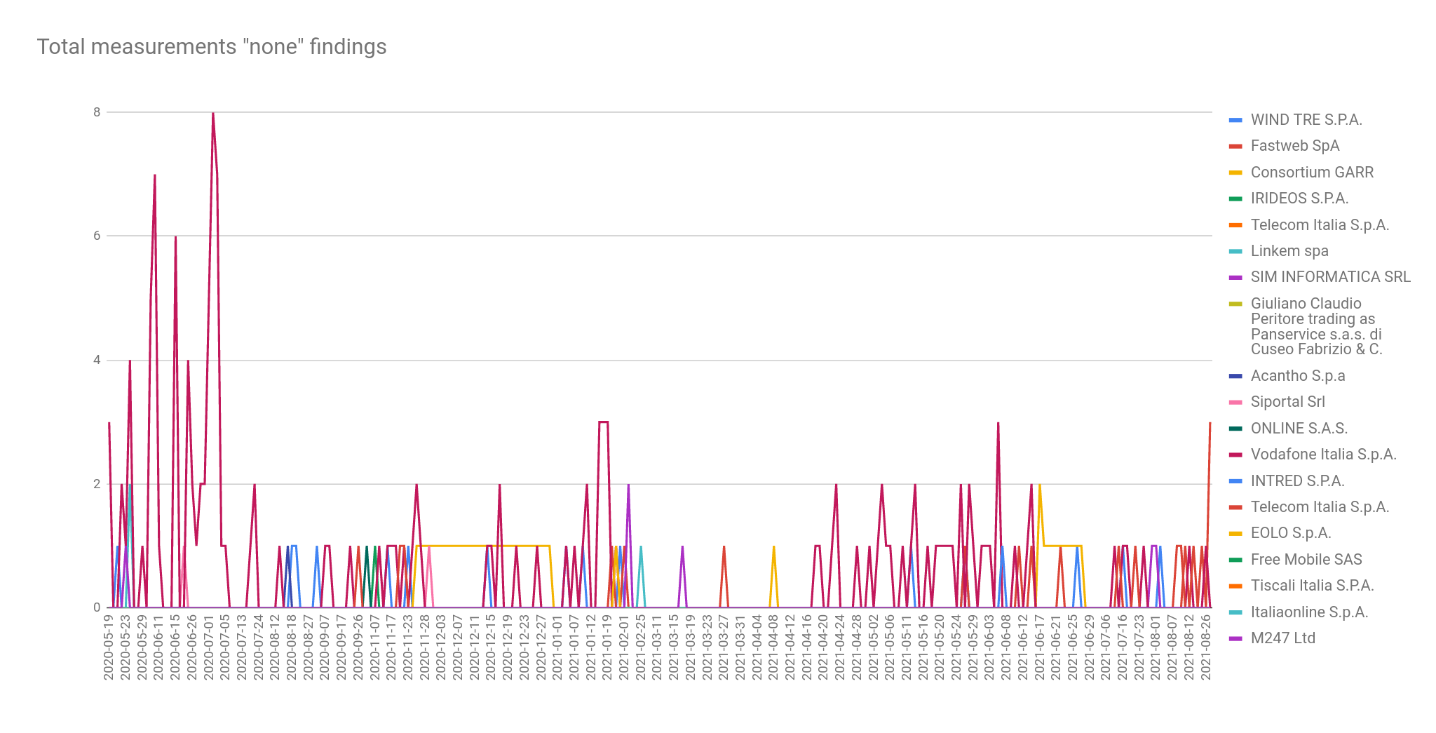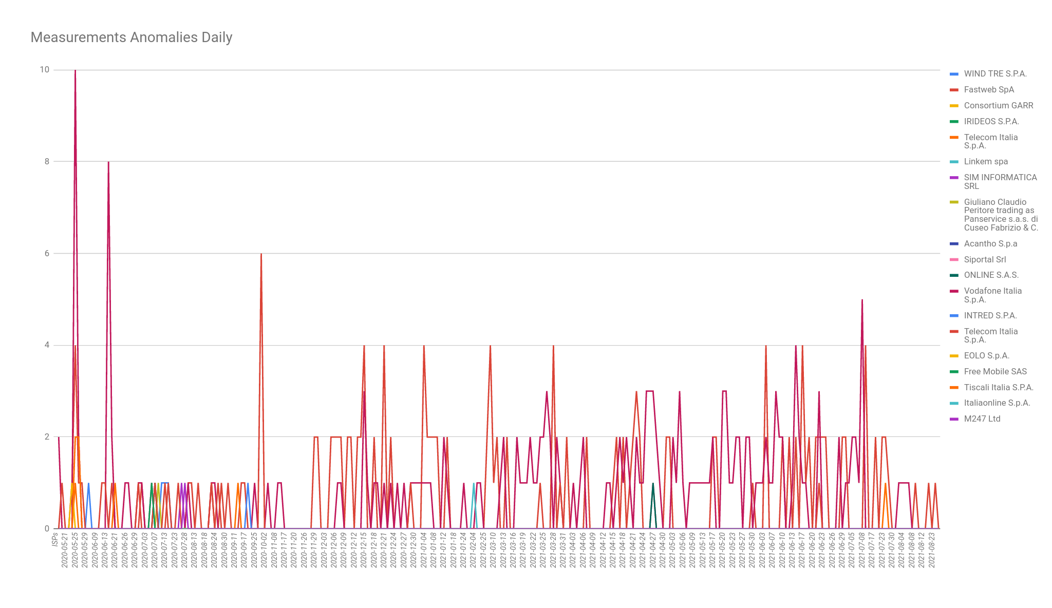 The following chart shares the volume of daily measurements that presented anomalies on 19 ISPs in Italy between May 2020 to August 2021.
