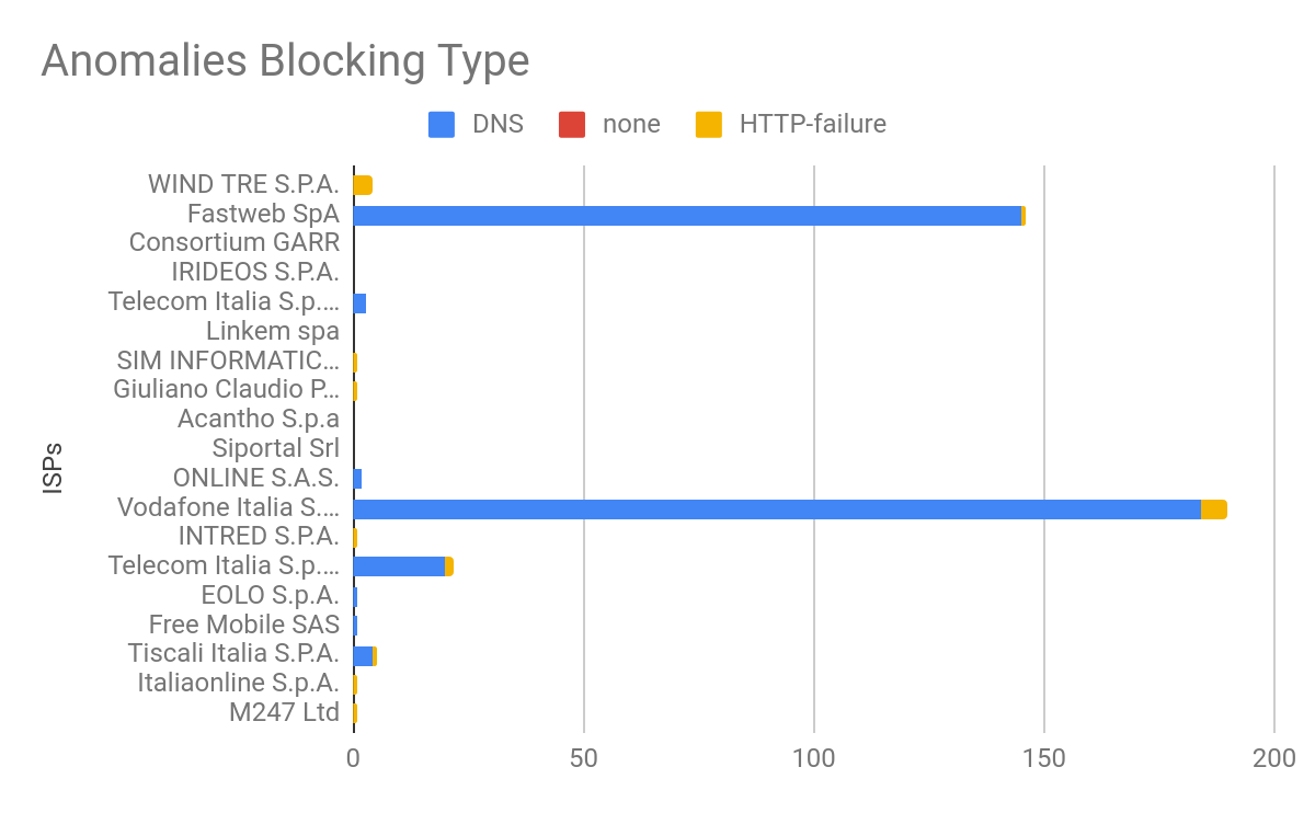 As can be seen through the graph, the majority (97%) of anomalous measurements on Vodafone Italia presented signs of DNS based interference, while a few (3%) presented HTTP failures. On Fastweb, 99% of anomalous measurements presented signs of DNS based tampering, while only 1% of measurements presented HTTP failures. On Wind, all (100%) anomalous measurements presented HTTP failures, but we observe limited testing coverage on this network, while all other measurements were successful (as illustrated through the previous chart).