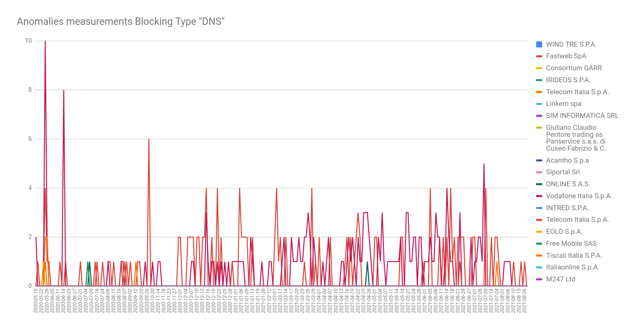 The following chart presents the number of daily OONI measurements that presented DNS anomalies on different networks in Italy between May 2020 to August 2021.