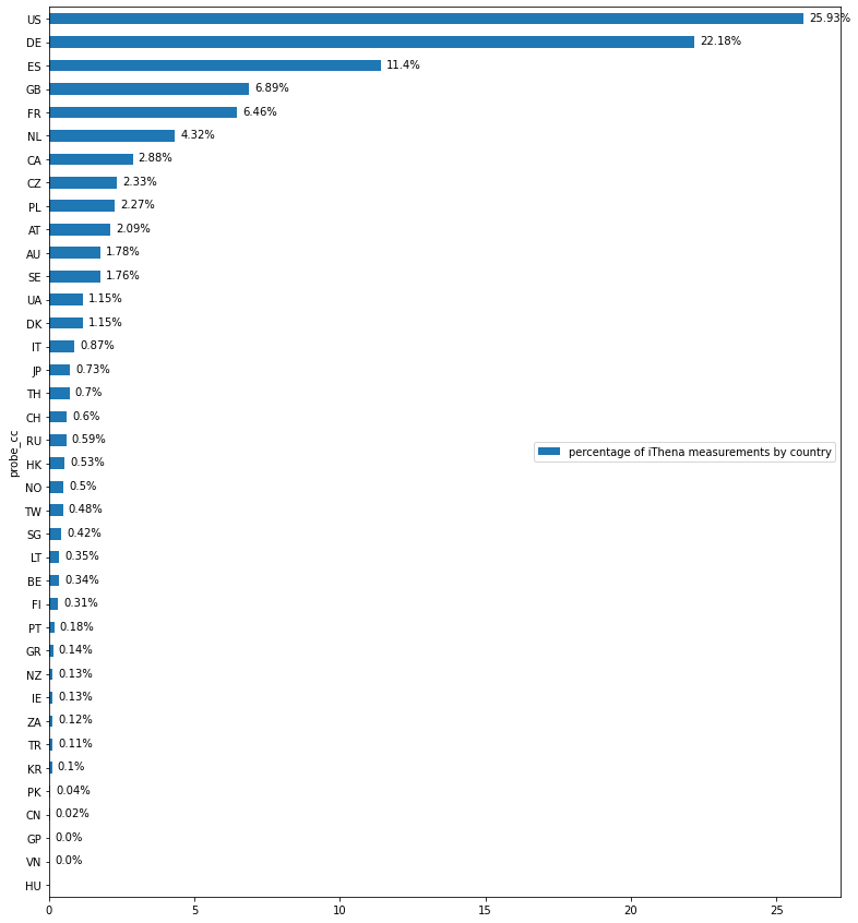 The above chart demonstrates that the largest volume of iThena OONI Probe measurements is contributed from the U.S. (with 7,606,694 measurements), followed by Germany (6,430,573 measurements), Spain (3,234,386 measurements), the UK (2,003,058 measurements), France (1,890,631 measurements), and the Netherlands (1,240,740 measurements).