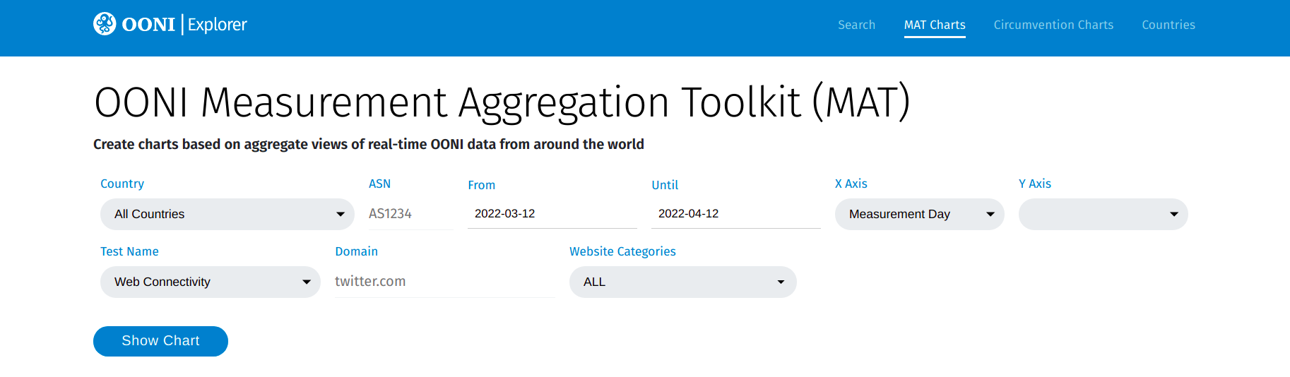 The MAT provides filters that enable you to select the parameters you care about in order to plot charts based on aggregate views of OONI data.