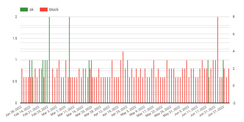 54 pages on political criticism were blocked during the testing period by and up to 4360 blocking times. Network operators may use DNS tampering and block IP addresses of these websites to blacklist and making them inaccessible. FPT and Viettel used DNS tampering whistle VNPT almost always uses TLS ‘connection timeout and close’. The result of blocking over time is a fluctuating variable.