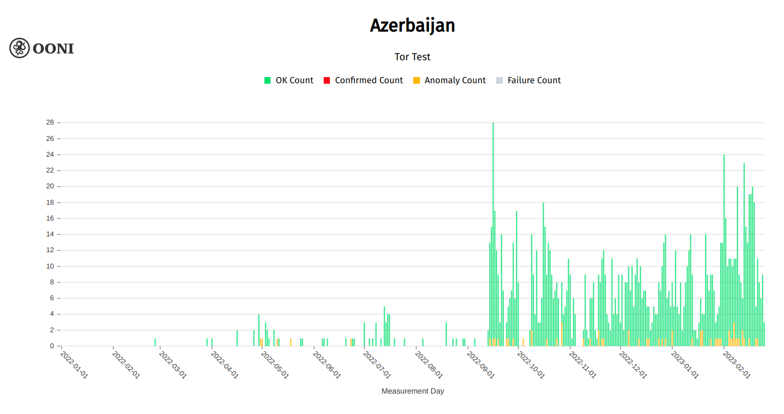 Chart: OONI Probe testing of Tor on 28 ASNs in Azerbaijan between 1st January 2022 to 25th February 2023 (source: OONI data).