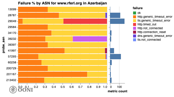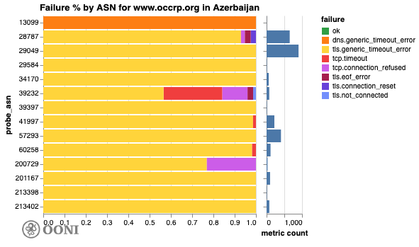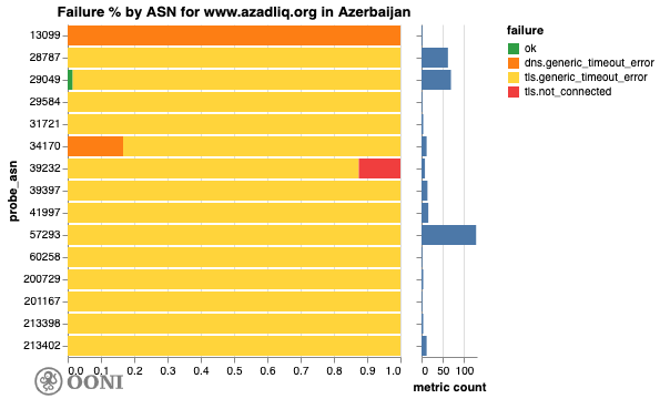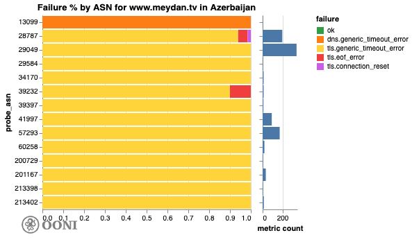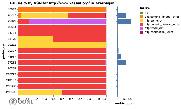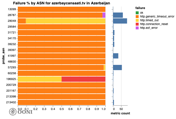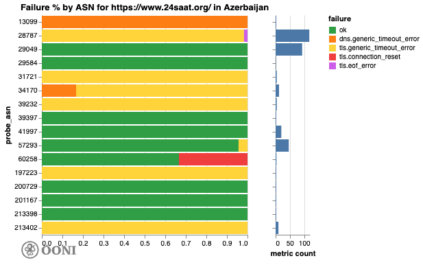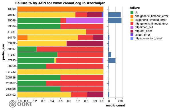 Similarly, we observe the prevalence of connection timeouts in the testing of many other news media websites across ASNs. The following chart provides a per-ASN breakdown of the measurement results from the testing of azerbaycansaati.tv