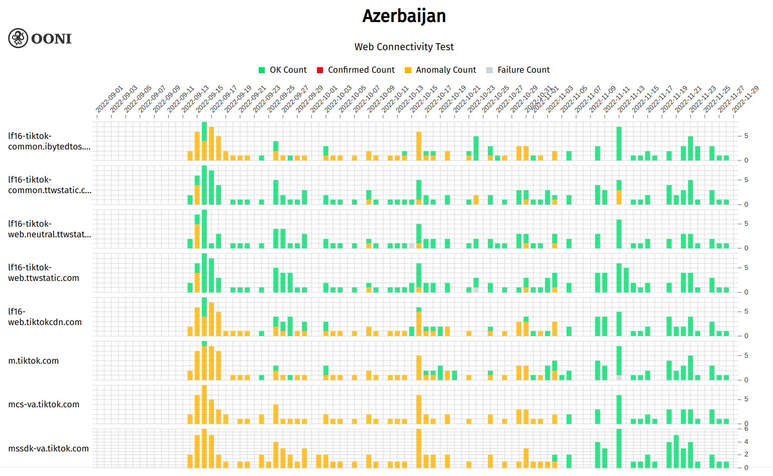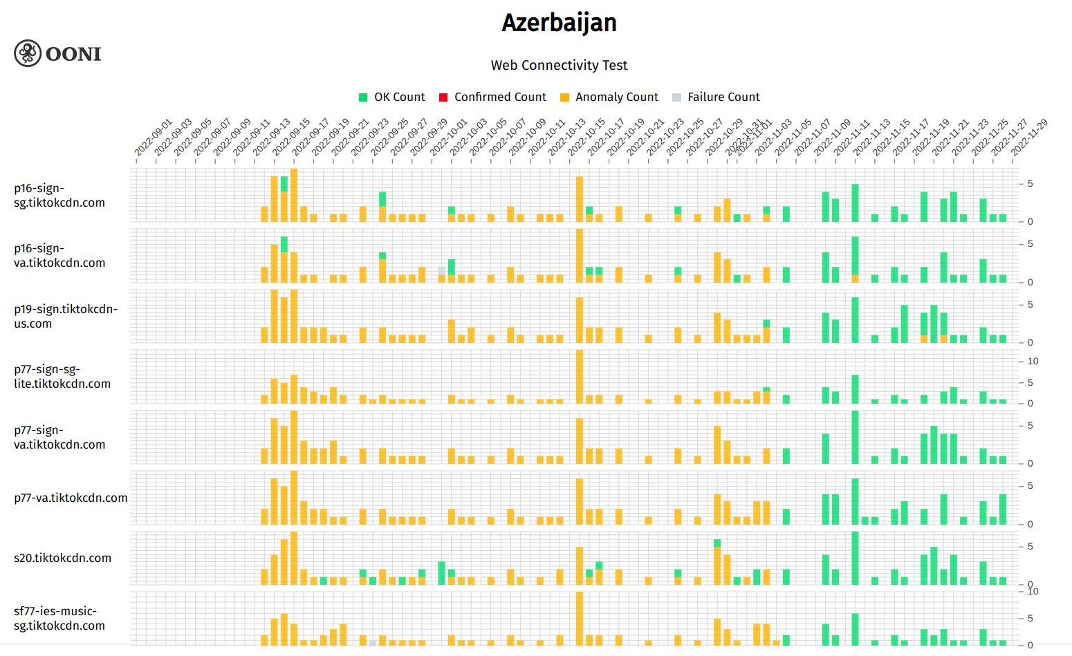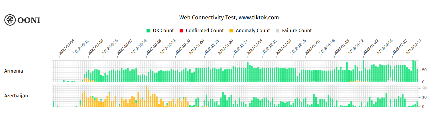 On 14th September 2022, Azerbaijan’s state security services announced the temporary suspension of TikTok. According to the statement, the content circulating on the social media platform was revealing military secrets and forming wrong opinions in society. As a result, the State Security Service decided to temporarily block access to the platform. Similarly, OONI data shows that the testing of TikTok also started to present signs of blocking in Armenia from 13th September 2022 onwards.