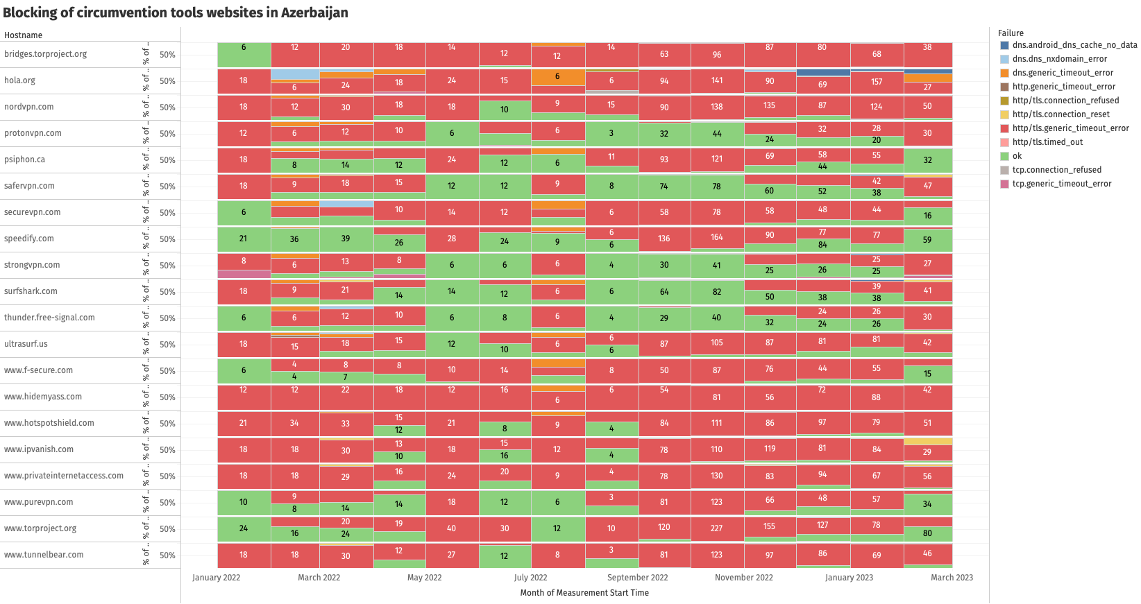 - Blocking of circumvention tool sites. Azerbaijan continues to block access to numerous circumvention tool websites, potentially limiting the ability to circumvent internet censorship in Azerbaijan. However, most OONI measurements suggest that tested circumvention tools (Tor and Psiphon) appear to be reachable.