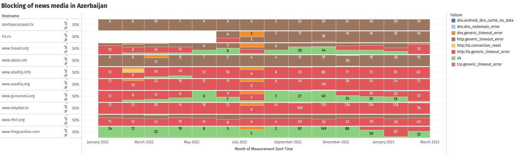 The following chart aggregates OONI measurement coverage (from 26 ASNs) for the news media domains that presented the strongest signals of blocking in Azerbaijan between January 2022 to February 2023.
