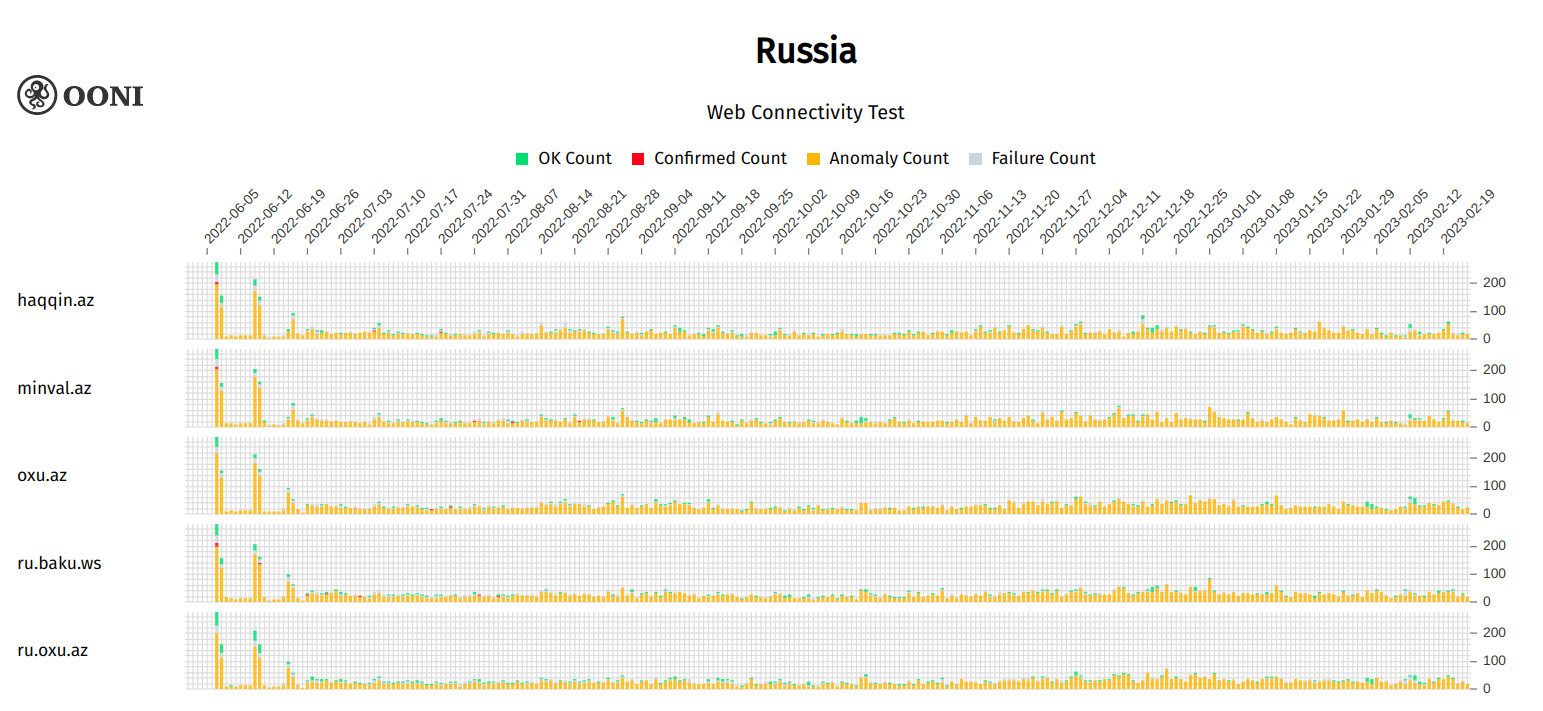 Chart: OONI data on the blocking of Azerbaijani news media websites in Russia between 7th June 2022 to 24th February 2023 (source: OONI data).