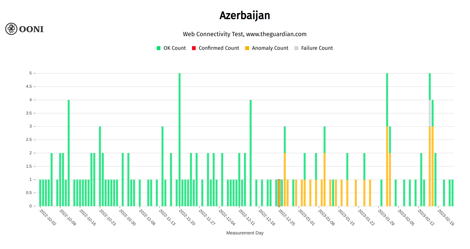 started to present anomalies in Azerbaijan. The following chart aggregates OONI measurement coverage from the testing of www.theguardian.com