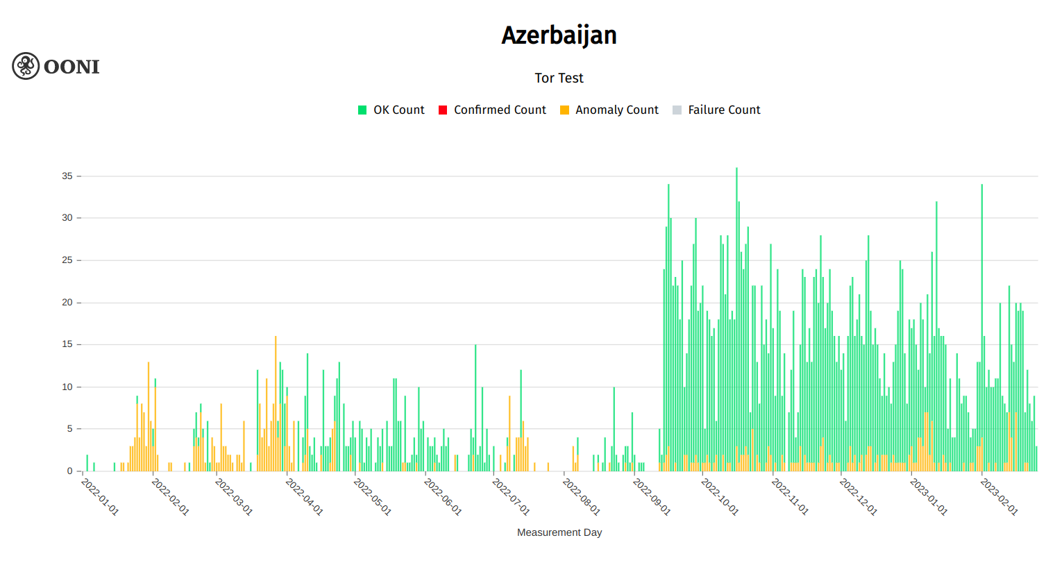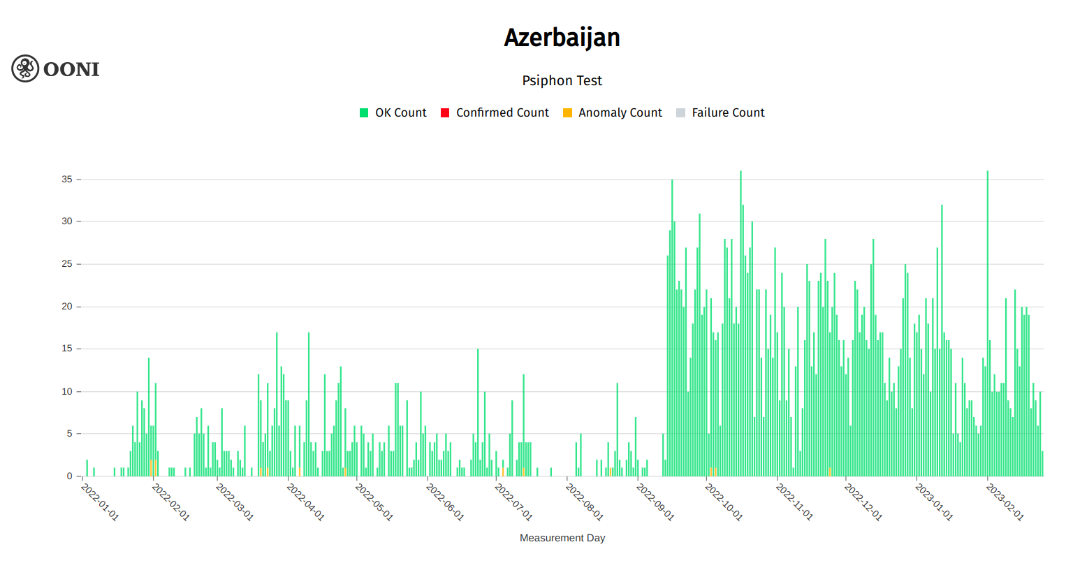 We attempt to address this question as part of this report. Specifically, we analyzed OONI data collected from Azerbaijan between January 2022 to February 2023 with the goal of evaluating which tested services presented signs of blocking, and whether new blocks had emerged over the past year (in comparison to our previous report).
