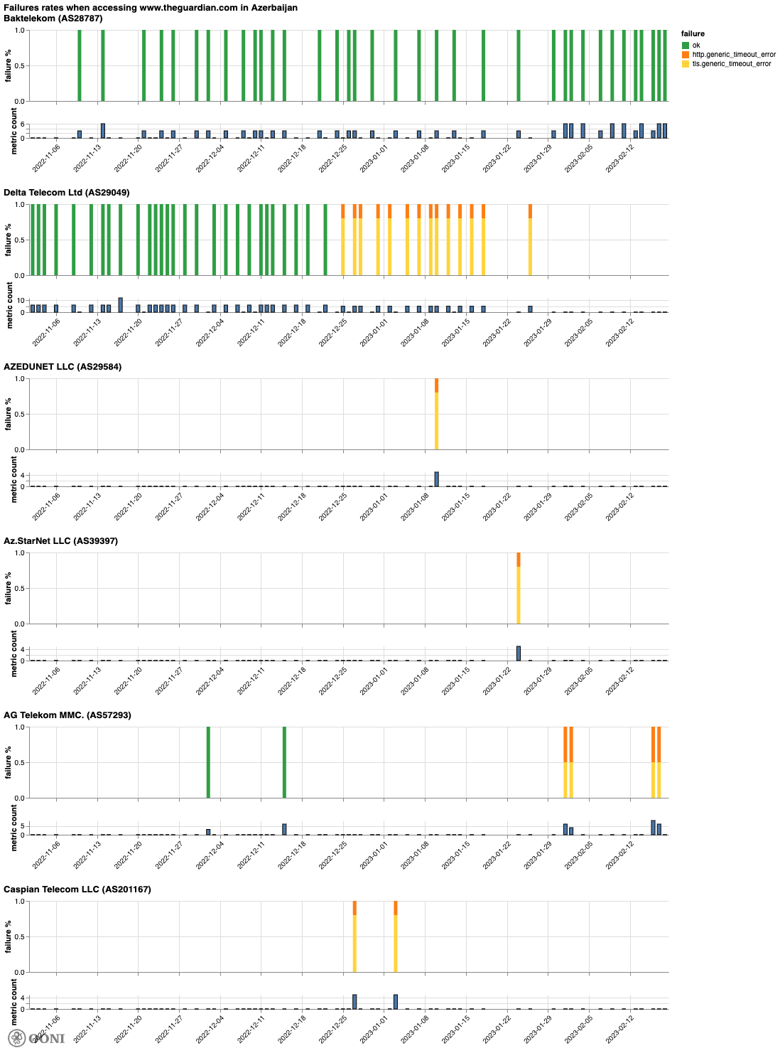 may be blocked on a few networks in Azerbaijan (particularly on AS29049 where we observe the largest volume of anomalies, which is consistent from 25th December 2022 onwards), it’s worth noting that it’s accessible on other networks (such as AS28787, where almost all measurements are successful). As we didn’t come across any news articles reporting the recent blocking of the Guardian in Azerbaijan (which could have helped corroborate the anomalous data), and the overall measurement volume is quite low, our confidence in confirming this potential block is rather limited.