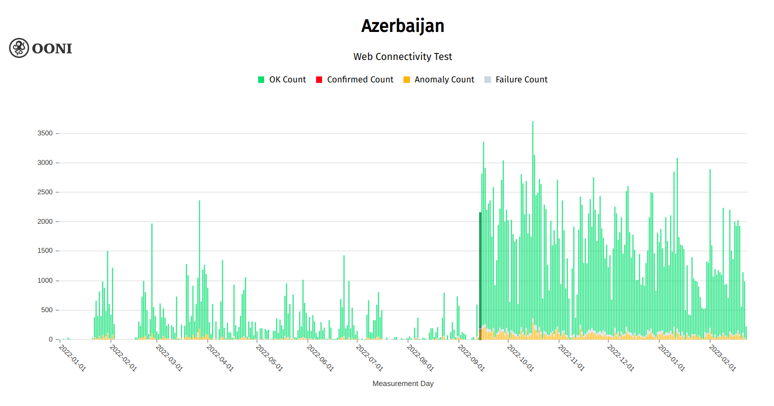 Chart: OONI Probe Web Connectivity testing in Azerbaijan between 1st January 2022 to 23rd February 2023 (source: OONI data).