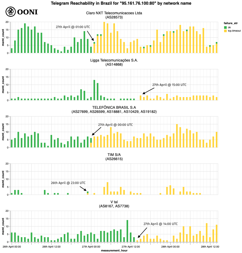 As is evident through the above chart, TIM was the first provider to implement the block at around 23:00 UTC on 26th April 2023, followed by Telefônica Brasil an hour later, followed by Claro the following hour. Several hours later, at around 14:00 UTC on 27th April 2023, V tal (also known as Oi) started blocking Telegram, followed an hour later by Ligga.