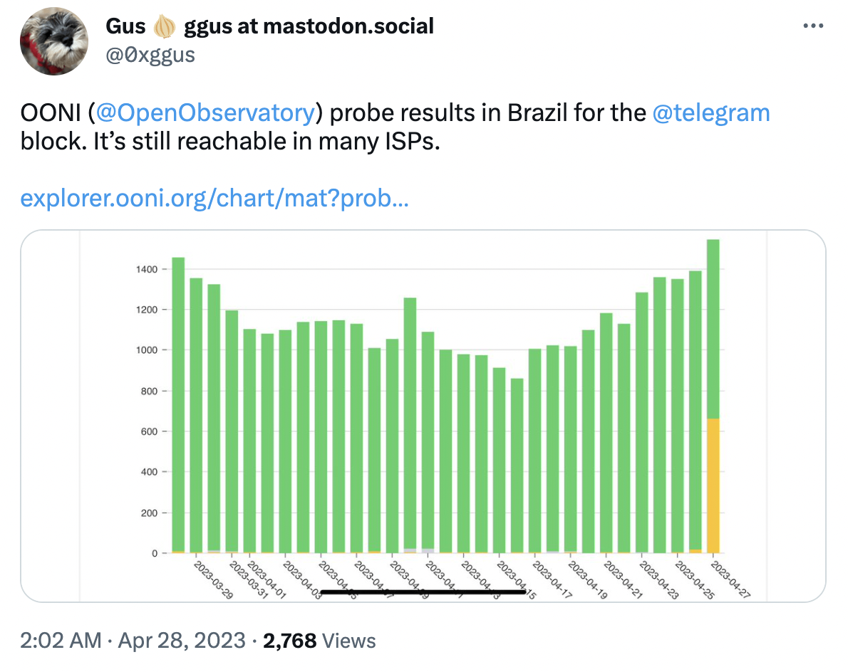 Starting from 26th April 2023, several ISPs in Brazil started to block access to Telegram. Community members from Brazil shared OONI data on the block with their networks. Gustavo Gus from the Tor Project, for example, reported the blocking of Telegram in Brazil by sharing relevant OONI data on social media.