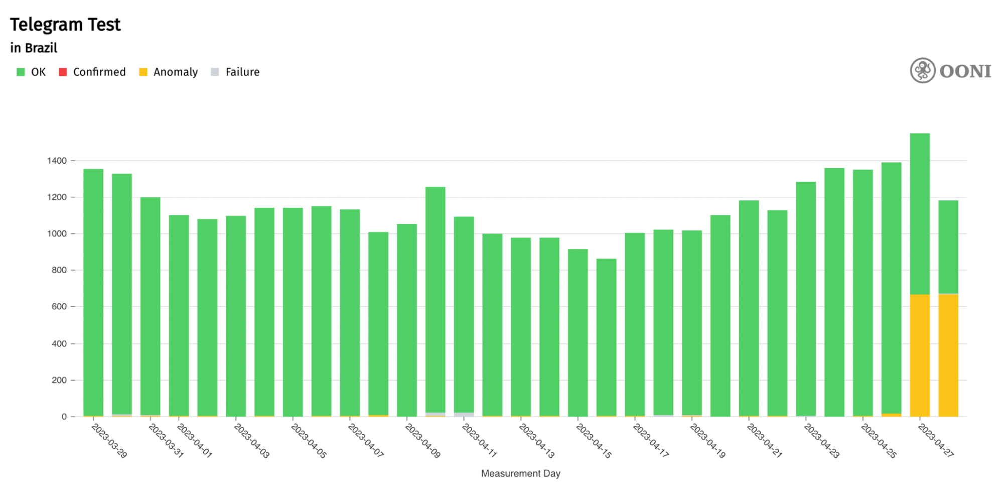 Starting from 27th April 2023, OONI Probe testing of Telegram in Brazil started to present a spike in anomalous measurements, as illustrated in the following chart.