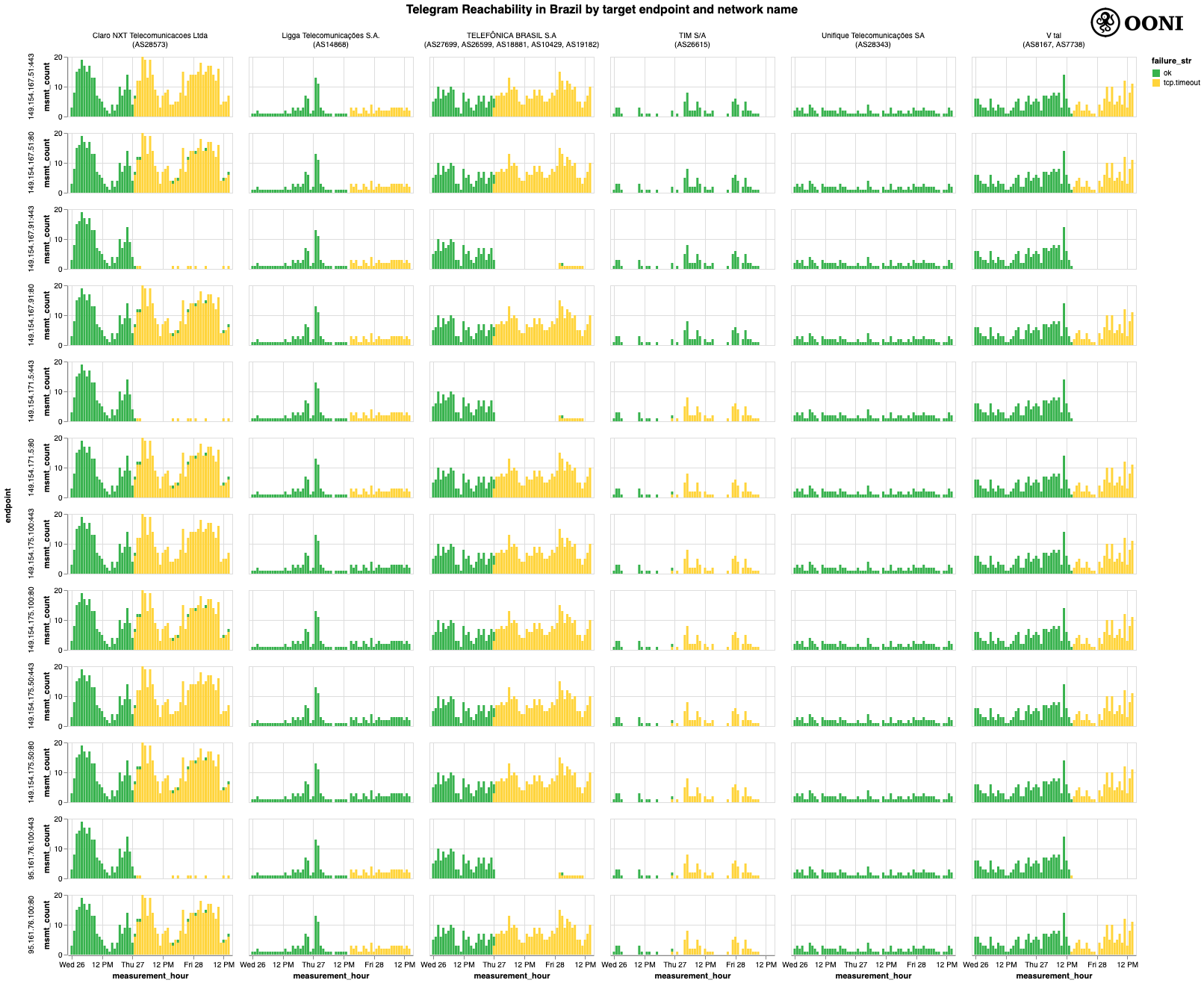 A per-ASN breakdown of the measurement coverage suggests that Telegram is not blocked on all tested networks in Brazil. OONI data, for example, shows that Telegram was reachable when tested on AS262374 on 28th April 2023, as the relevant measurements show that connections to the tested Telegram endpoints were successful. However, it is possible that blocking may have been implemented for Telegram endpoints not currently included in the OONI Probe Telegram experiment. Moreover, the fact that the OONI Probe Telegram experiment requires all tested endpoints to fail in order to be annotated as “anomalous” means that it’s possible that in cases where only a few endpoints are blocked (instead of all), those measurements would be annotated as “successful”. We implemented this heuristic because, when we wrote the experiment, it was sufficient for a single DC endpoint to be accessible for the Telegram app to work as intended. As mentioned previously, we may need to review our heuristics.