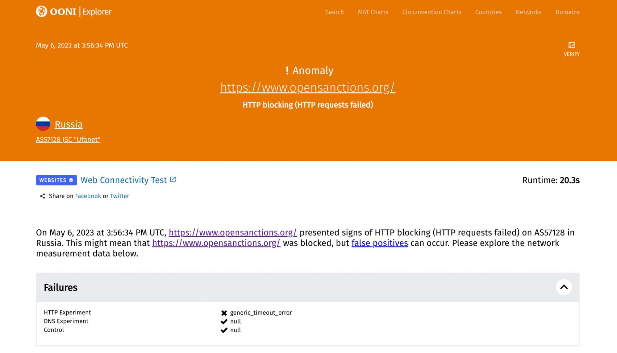- New user feedback reporting mechanism, available through the “Verify” button in the banner of each OONI measurement page.