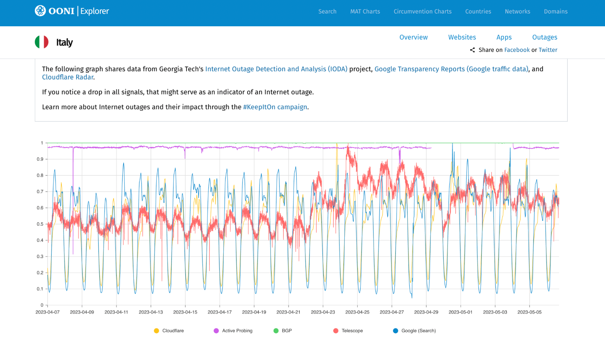 The charts in the country-specific pages share IODA, Google traffic, and Cloudflare Radar data monitoring overall internet connectivity in a specific country (e.g. Italy).