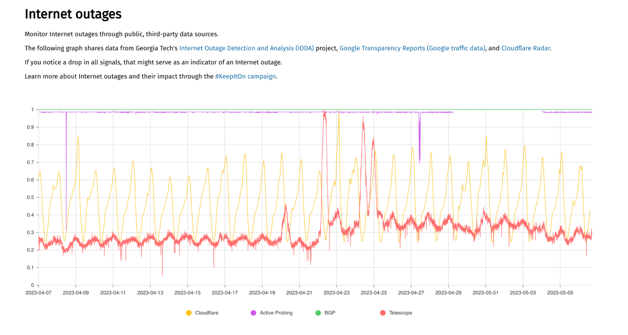 - New “internet outage” charts (integrating IODA, Google traffic, and Cloudflare Radar data), available in each country-specific and network-specific page;