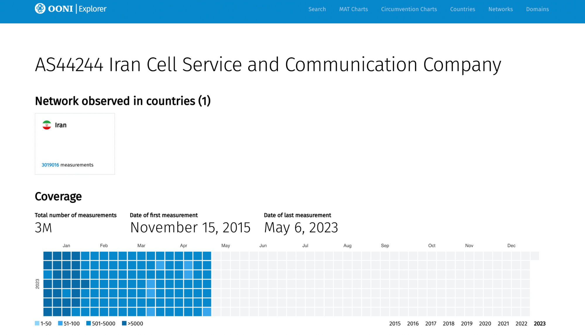 By clicking on any of the displayed ASs on the OONI Explorer Networks page, you will access the relevant measurement page for that AS. In the example below, we have clicked on the measurement page for AS44244 Iran Cell Service and Communication Company
