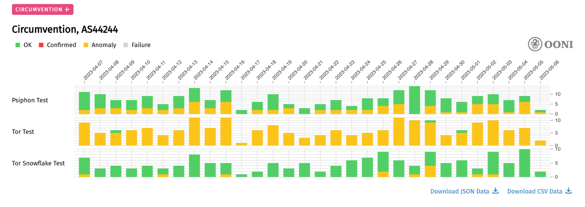 This chart enables you to view the testing coverage of these circumvention tools on the specific network, and to check if they present signs of potential blocking (this is suggested mainly for Tor, as we see that almost all measurements present anomalies).