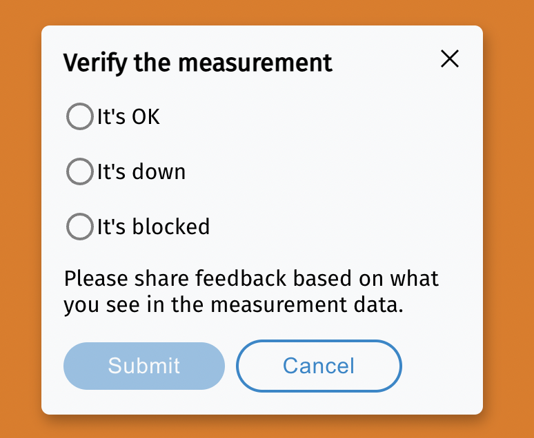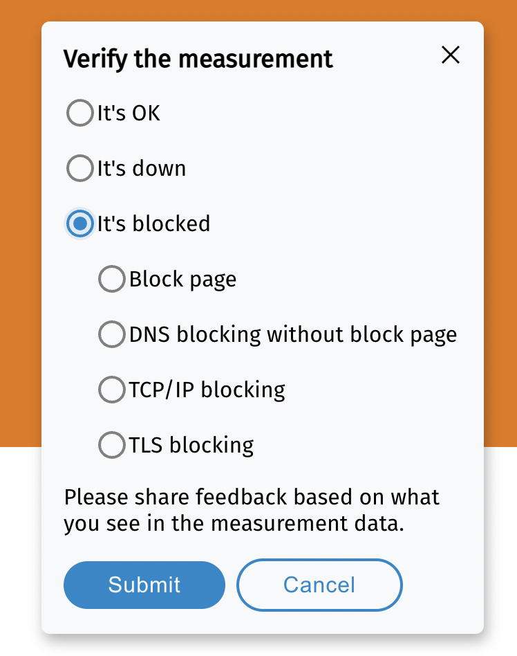 As part of our ongoing efforts to improve OONI data quality, we launched a new feature that enables you to help out! With the new user feedback reporting mechanism, you can share feedback on OONI measurements. Such feedback will help us improve our methods for measurement and analysis, improving the overall quality of OONI data.