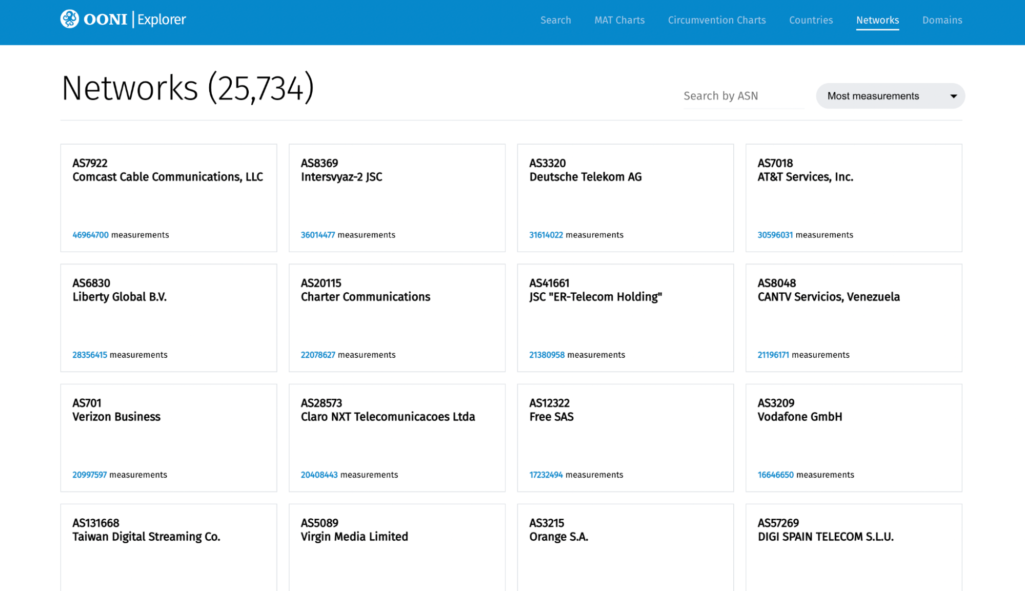 With the new network-centric pages on OONI Explorer, you can learn about all OONI Probe testing on a specific ASN. Overall, OONI Probe users globally have run tests on more than 25,000 networks, and you can find dedicated measurement pages for each of these networks.
