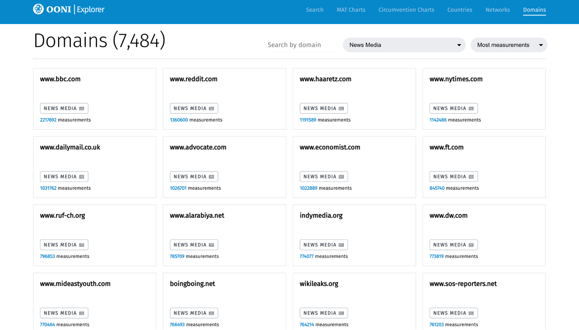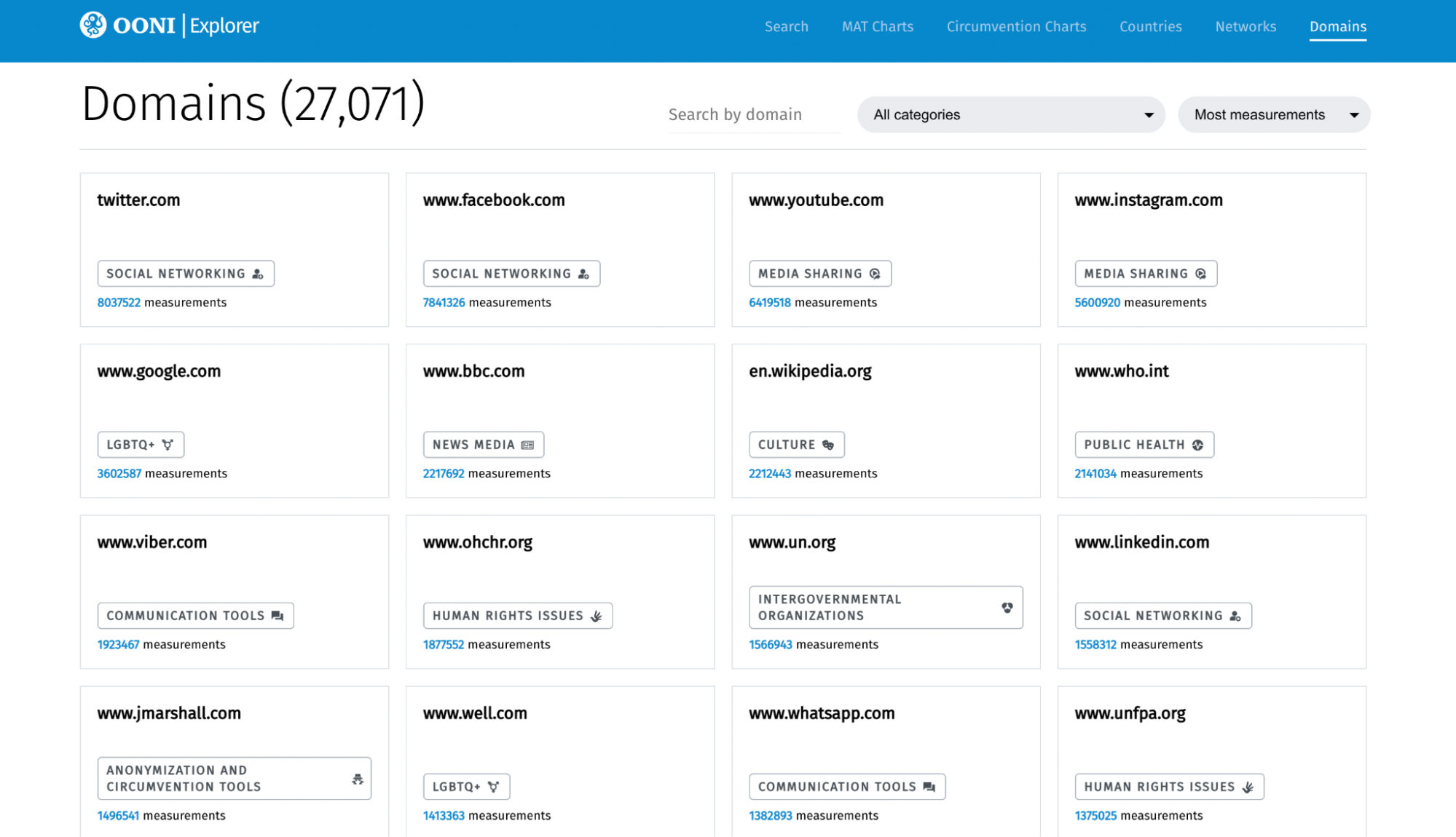 We launched new domain-centric pages that enable you to view OONI measurements pertaining to the OONI Probe testing of specific domains. Overall, OONI Probe users around the world have tested more than 27,000 domains for censorship, and you can find dedicated measurement pages for each of these domains.