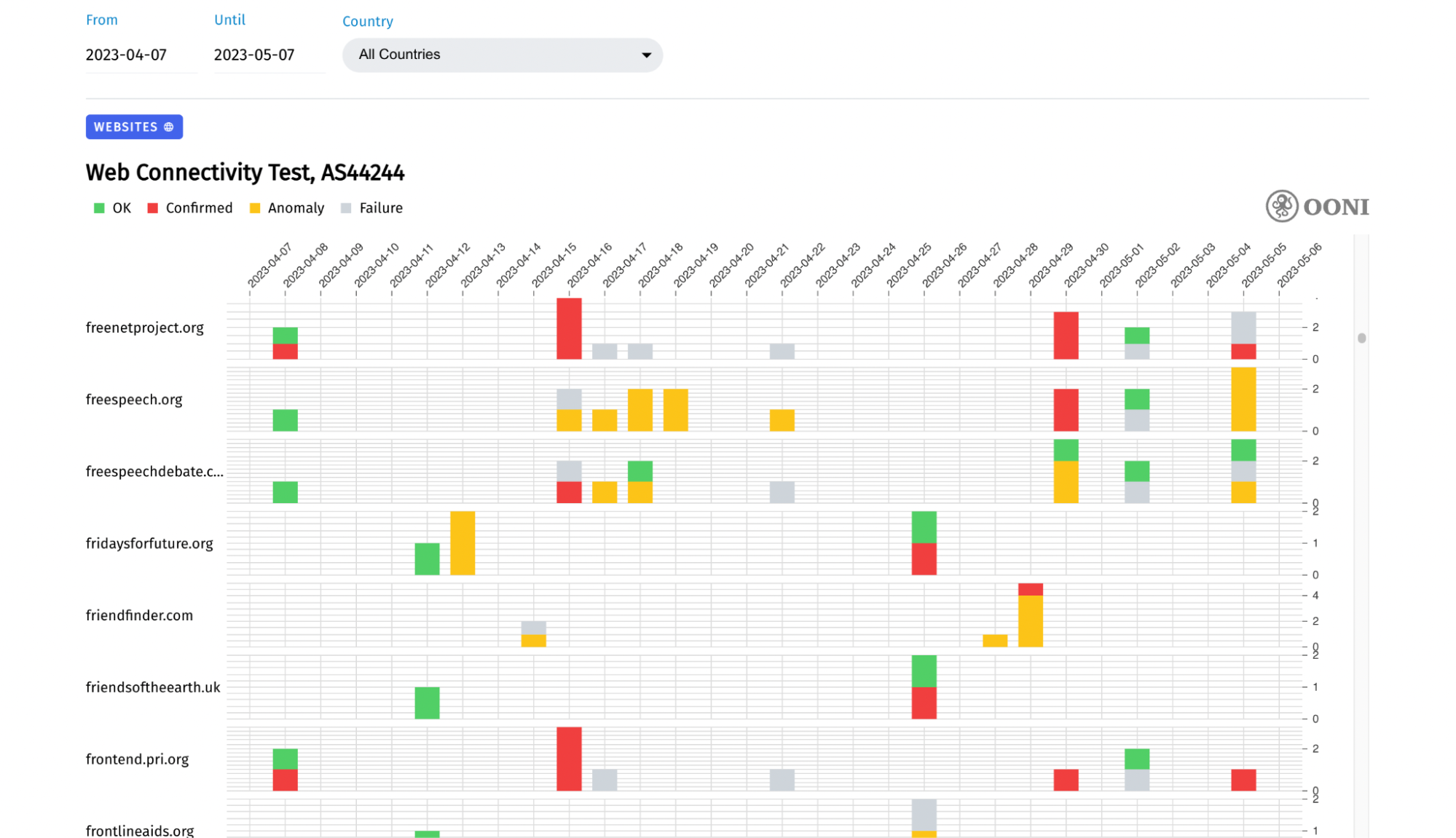By scrolling through this chart, you can discover websites that are blocked on this network, and compare the testing of different domains (accessible domains are annotated as “OK”, likely blocked domains are annotated as “Anomaly”, confirmed blocked domains are annotated as “Confirmed”, while failed measurements are annotated as “Failure”). You can adjust the date range by changing the From