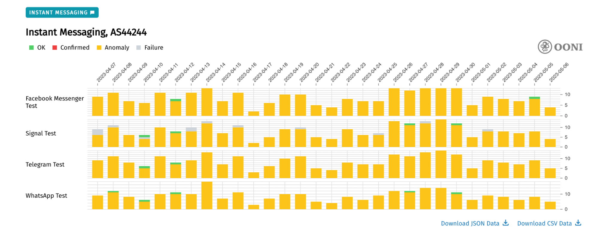 From the above chart, it is evident that almost all OONI measurements collected from the testing of these apps presented anomalies on this network, strongly suggesting that they’re blocked.