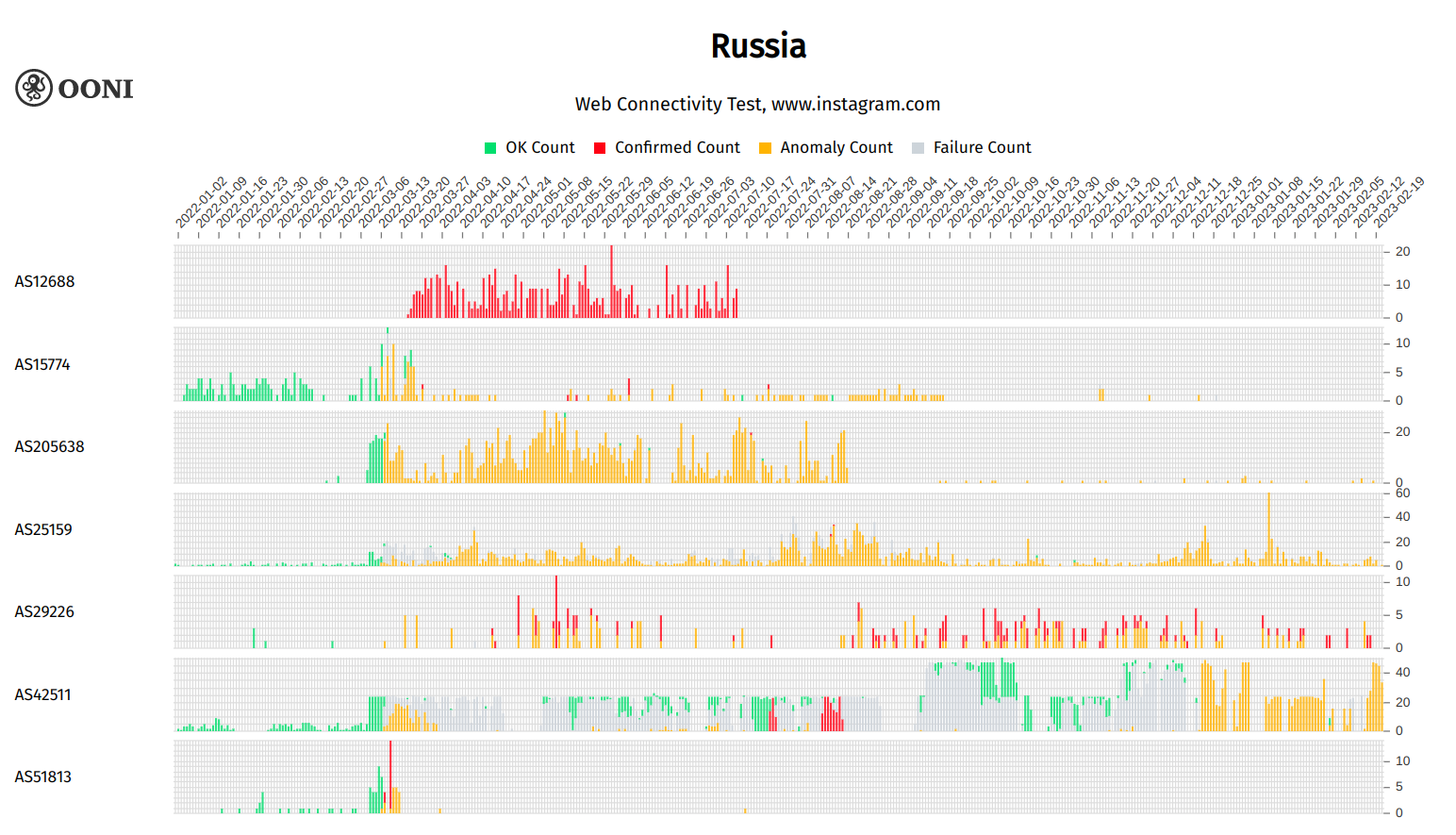 was previously found accessible on tested networks, and only started presenting a large volume of anomalies on 13th March 2022 – which matches the blocking date listed in the official registry. Most subsequent measurements have continued to present anomalies, demonstrating that Instagram remains blocked on most tested networks in Russia.